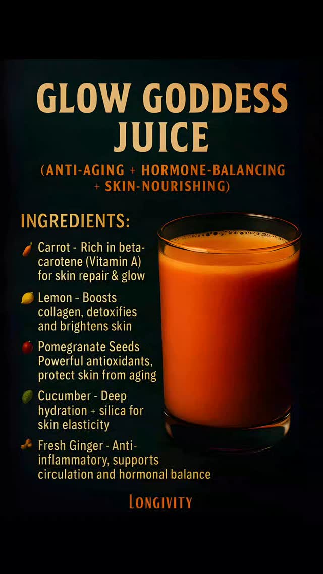 ✨ Glow Goddess Juice ✨ (Anti-Aging Hormone-Balancing Ask Skin-Nourishing) 💃 This isn’t just a juice... it's a beauty ritual in a glass. Crafted to support your natural glow, hormonal harmony, and ageless skin — from the inside out. 🧡 Why it works: 🥕 Carrot – Bursting with beta-carotene (Vitamin A) to brighten skin & support repair 🍋 Lemon – Detoxifies, boosts collagen & fades dullness 🍎 Pomegranate Seeds – Fight premature aging with powerful antioxidants 🥒 Cucumber – Delivers deep hydration + silica for skin elasticity 🌱 Fresh Ginger – Anti-inflammatory & hormone-supportive 💧 Coconut Water – Replenishes electrolytes & keeps your glow hydrated #nourishyourskin #dryskin #exfoliate #skinhealth #skinfirst #hydratedskin #lovemyskin #skinglow #holisticliving #india #antiinflammatory #agedefying #healthyskintips #hormone #toxinfreebeauty #skinbenefits #feedyourskin #longivity #womenhealth #healthyskinisin #beautifulskin #longevity #safeskincare #healthy #viralreels #skindetox #nourishing