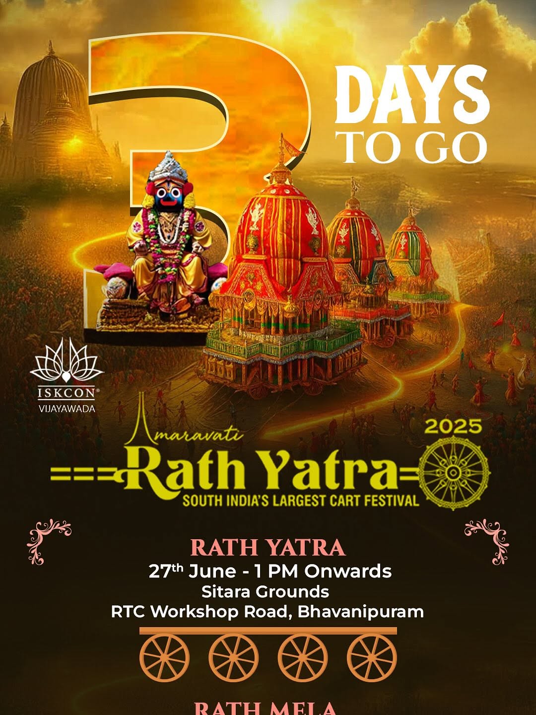🌟 HE IS COMING! 🌟 Get ready, Vijayawada! The Jagannath Rath Yatra 2025 is rolling in with divine energy, devotion, and celebration like never before! 🛕 Inauguration: 📍 Sitara Grounds, Bhavanipuram 🗓️ 27th June, 1:00 PM – 3:00 PM 🎉 Chief Guest: Hon’ble CM Sri N. Chandrababu Naidu 🎭 Cultural programs, pooja, and opening ceremony 🚩 Rath Yatra Procession: 🕒 Starts at 3:00 PM 📍 Route: Swathi Theatre Rd → Durga Temple Rd → Rath Center → Sitamma Vaari Paadalu 🏁 Final Stop: Gundicha Mandir (Sitamma Vaari Paadalu Grounds) 🎪 Rath Mela & Festivities (June 28–29): ✨ Sudarshan Yagna 🎶 International Devotee Bands 💃 Cultural Performances & Folk Dances 🔁 Rath Pradakshana (Parikrama) 🍛 Maha Prasadam for all 💫 Feel the Extraordinary! Join thousands in pulling the divine chariot—a symbol of love, unity, and spiritual upliftment. 🕉️ Jai Jagannath!