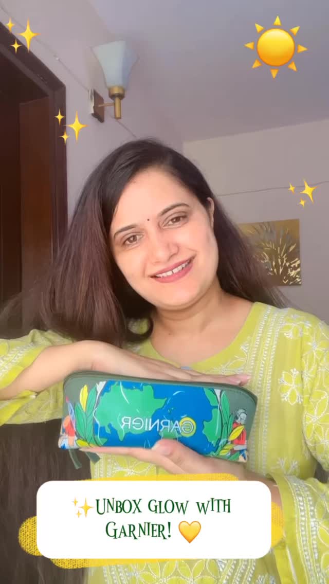 1- Garnier Earth-Themed Zipper Pouch “Carry your glow wherever you go 🌍💚 With this nature-inspired Garnier pouch.” 2-Garnier Micellar Cleansing Water (Vitamin C) “Goodbye dullness, hello glow! ✨ Remove makeup and dirt in one swipe with Vitamin C power.”. 3-Garnier Bright Complete Vitamin C Booster Serum “Brighten up! 💛 Say goodbye to dark spots with 30x Vitamin C power in every drop. 4-Garnier Super UV Invisible Serum Sunscreen SPF 50+ (Vitamin C) “Invisible shield, visible radiance! ☀️ SPF 50&PA++++ Lightweight Invisible + Runny Texture Leaves No white cast & Absorbs Quickly 99% sun damage protection Contains Vitamin C - which corrects the dark spots meets Vitamin C for daily sun-safe glow.” 5-📝 5. Garnier Info Booklet “Because glowing skin starts with knowing your glow routine 📖💛 #GarnierCare” #UnboxingMyGarnierSkinEssentials #GarnierIndia #Garnier #Skincare #PR #Ad #PRKit