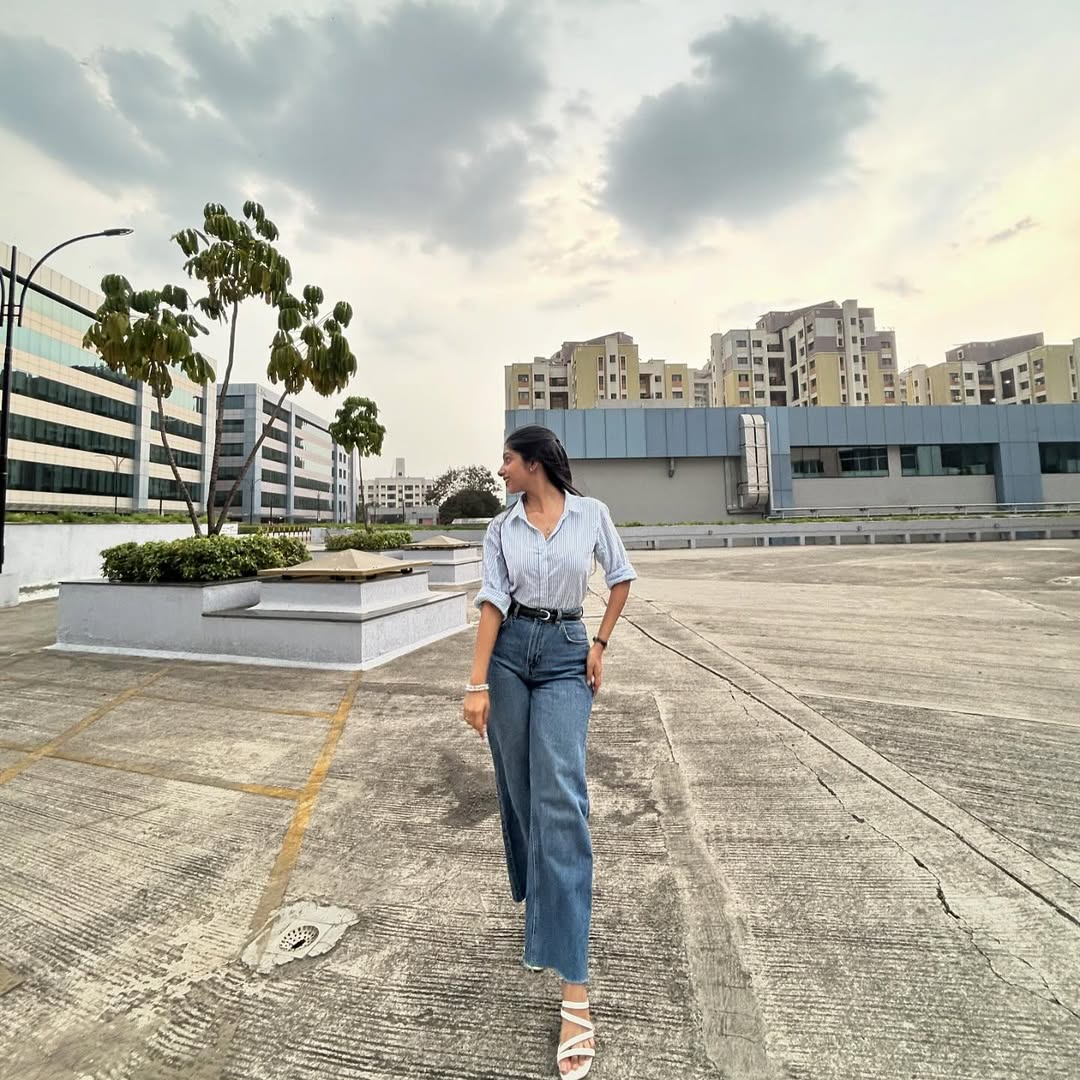 Blue skyy 🏙️⛈️ #blue #sky #ootd #formal #look #hair #magarpatta #photography #instagood #fypシ #explore #feed #love #sky #clouds #jeans #heels