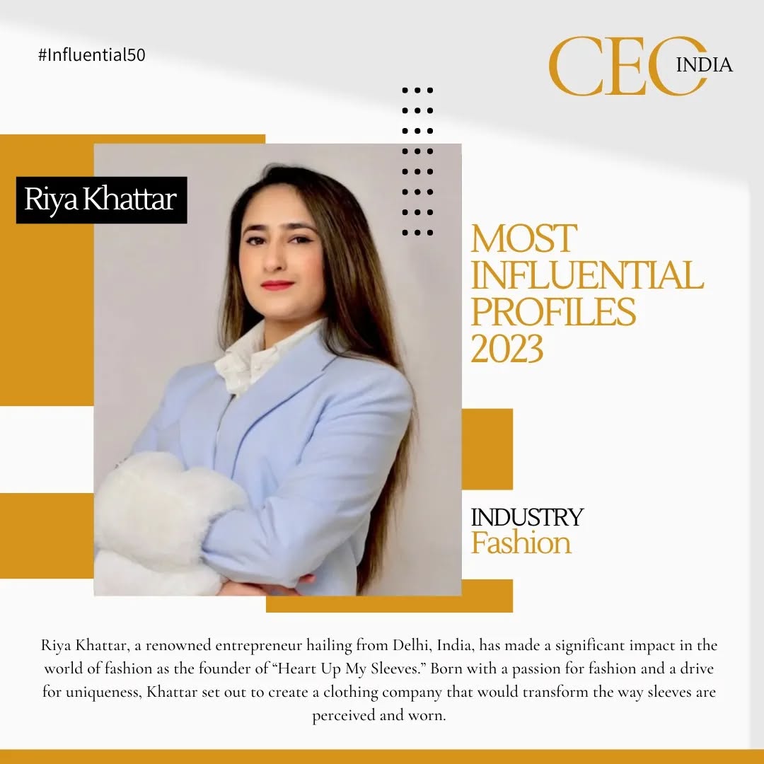 #31 Riya Khattar, a renowned entrepreneur hailing from Delhi, India, has made a significant impact in the world of fashion as the founder of “Heart Up My Sleeves.” Born with a passion for fashion and a drive for uniqueness, Khattar set out to create a clothing company that would transform the way sleeves are perceived and worn.