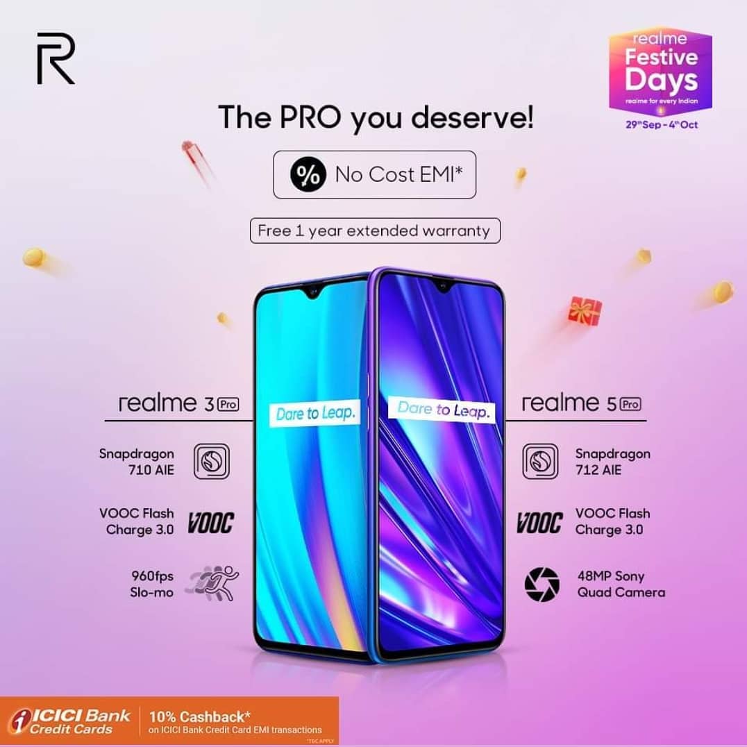Performance that is meant to cater to the enthusiasts! #realme3Pro and #realme5Pro are available with great offers during #realmeFestiveDays from 30th September till 4th October on realme Store. Choose your Pro here https://www.realme.com/in/