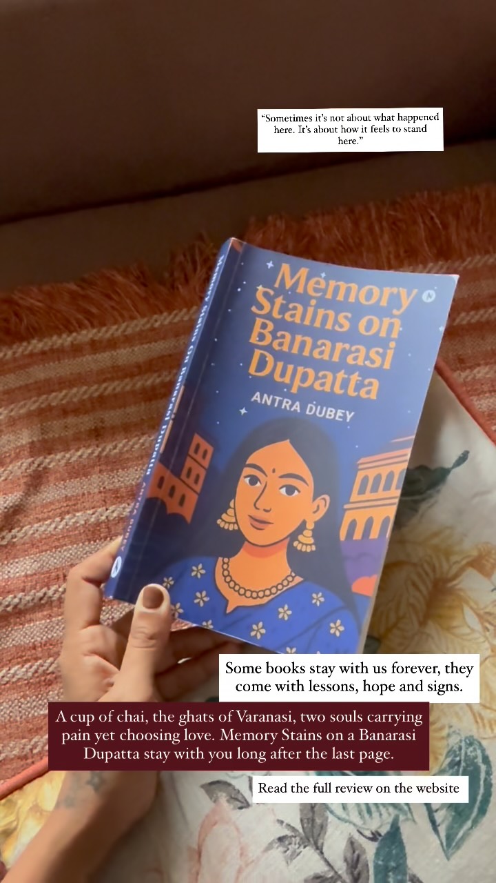 ▶️ How does healing look like? Some books leave us with lessons, some with hope, and some with signs that guide us quietly. Memory Stains on Banarasi Dupatta by Antra Dubey is one such book for me. It’s a reminder to hold on to hope even in the darkest corners, not to let trauma define us, and not to pass down the pain we have endured. More than just a story, this book feels like an experience, an emotion that lingers beyond words. From the very beginning, the title and cover stole my heart. The moment I picked it up, I knew this wasn’t just another read but a journey filled with reflections, surprises, and lessons. It’s unputdownable. I finished it in just a few hours, and yet it carried so much within it: countless moments, unforgettable lessons, and a quiet nudge to flow with life instead of resisting it. Set against the vibrant and soulful backdrop of Kashi (Banaras), Antra Dubey immerses us in the ghats of the Ganga, the narrow lanes filled with life, and even the taste of spicy tamatar chaat. Through this vivid landscape, we meet Maya and Swadesh – two people who could not be more different, yet are destined to cross paths in unexpected ways. Antra Dubey’s storytelling is captivating and immersive. With a strong narrative and a deeply engaging plot, she weaves a tale of family, relationships, fears, healing, and above all, love in its many shades. Her writing style is simple yet enthralling, making the story relatable. I loved how she balanced heavy, emotional moments with lightness and everyday realism, whether in the staffroom banter, the bustling ghats, or the quiet of a home. Each detail felt alive and true. Especially how she infused Banaras into every emotion of the novel—the ghats, the crowds, the quiet corners, the city’s pulse. It’s as if the city itself becomes a character in the story. Read the full review on the website. #bookreview #romance #booksongrief #readerviddh #bookbloggers #bookblog #fictionbooks #reading
