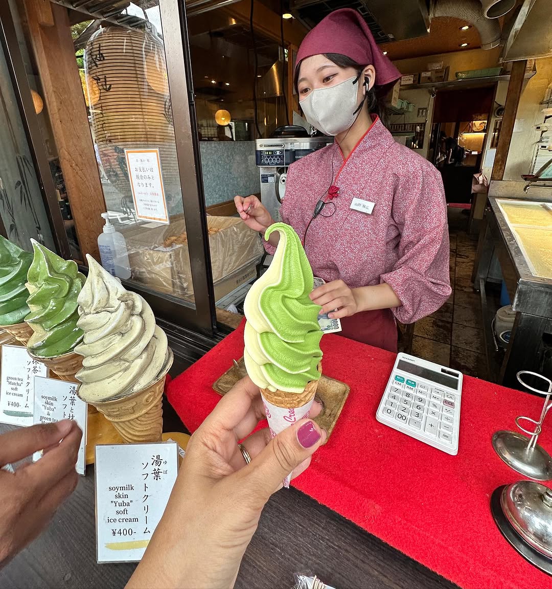 Things we try!! Soyamilk Skin “Yuba” & Green Tea Matcha ice cream 🤭 #japan #kyoto #soyamilk #icecream #yuba #greentea #matcha #rjheartnsoul