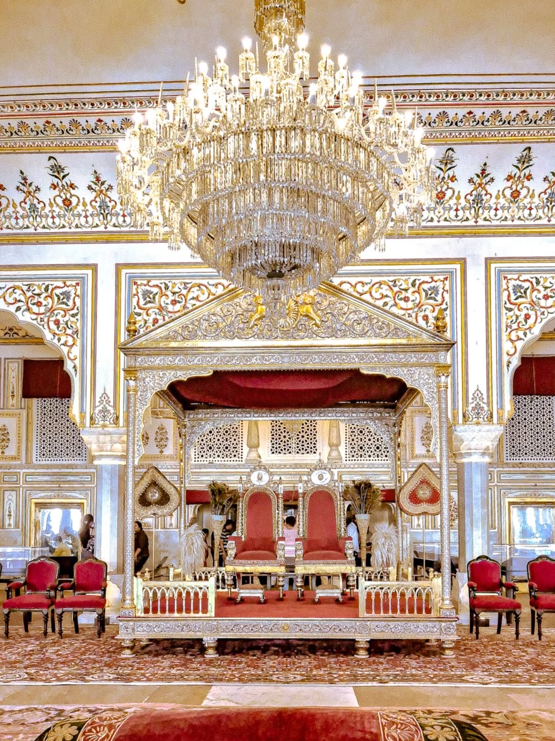 Once the grand Diwan-e-Aam of Jaipur’s City Palace, Sabha Niwas witnessed centuries of royal audiences, ministerial discussions, and visits from dignitaries. This opulent hall has now been restored to its original splendour reviving gilded floral frescoes, hand-carved marble columns, and a 600kg Bohemian crystal chandelier that was restored piece by piece. Sabha Niwas now serves as a gallery of Jaipur’s princely past, displaying heirlooms, paintings and court artefacts. #jaipur #citypalacejaipur