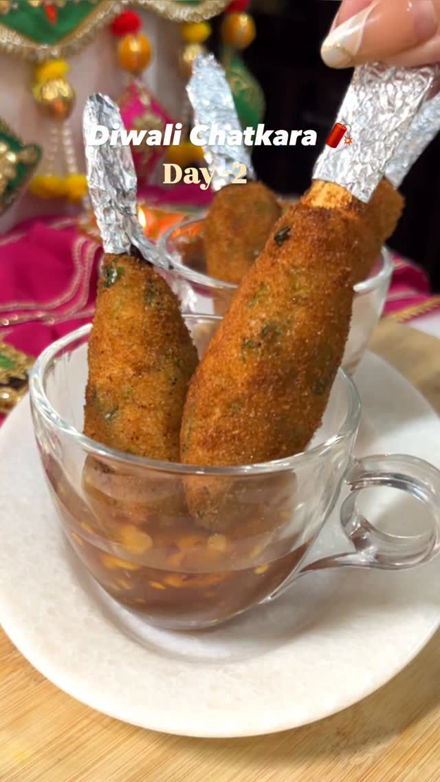 Yeh meri personal show stopper dish hai, btana zarur kaisa laga 😍 Veggie lollipop recipe: 1. Take 2 cups grated potato, add 1/2 cup chopped onion, capsicum, 1 tbsp green chillies, 1/4 cup coriander leaves. Add 1 cup bread crumbs. Add 1 tsp red chilli powder, coriander powder, garam masala, black pepper and salt. 2. Mix everything well and make a dough. To a stick or spoon make lollipop structure and then coat with (2tbsp maida + 2 tbsp cornflour with some water slurry) and then coat bread crumbs. 3. In hot oil fry the lollipops until golden brown. Serve with sweet chilli sauce Diwali snacks, diwali starters, diwali recipes, diwali party snacks, diwali party recipes, festive recipes, veggie lollipop, diwali food, veggie starters, potato recipes #diwalisnacks #diwalirecipes #festiverecipes #veggielollipop #potatorecipes #diwaliparty #partysnacks #diwalifood