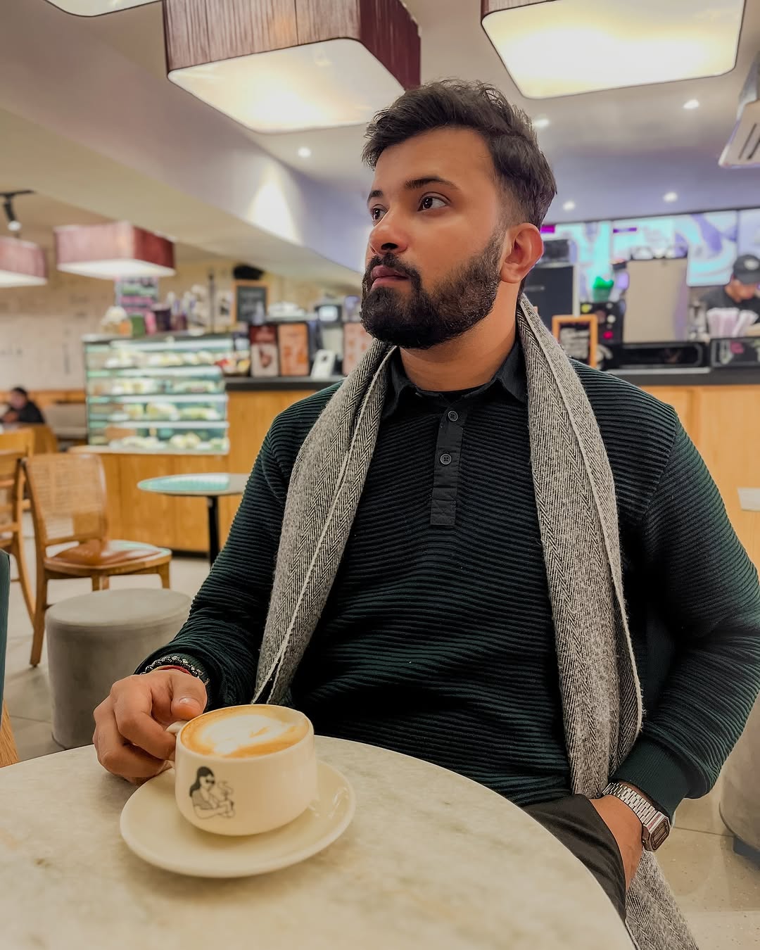 “Good coffee, great company, and timeless style. That’s the vibe. ☕🖤” . . #CafeDiaries #MenOfStyle #WinterVibes #SartorialElegance #CasualChic #SipAndSavor #DapperBaller #EverydayLuxury