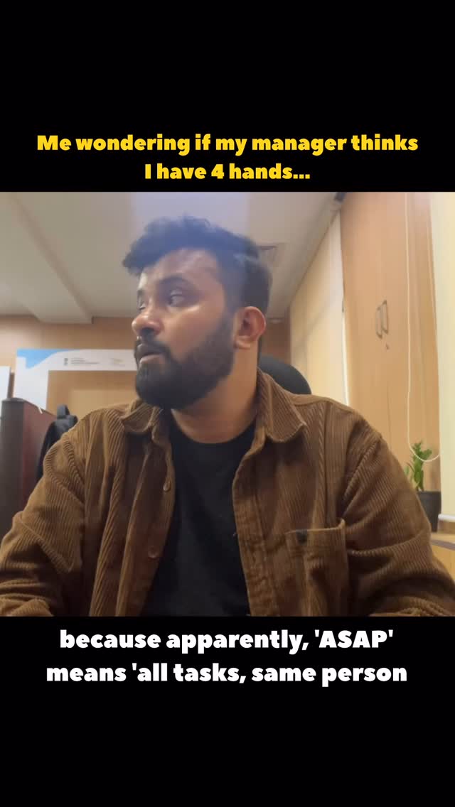 Me wondering if my manager thinks I have 4 hands… because apparently, ‘ASAP’ means ‘All Tasks, Same Person’! 🤯😂 #SendHelp . . . #OfficeHumor #WorkMemes #OfficeMemes #WorkProblems #CorporateMemes #WorkLife #OfficeLife #WorkFromHome #FunnyReels #MemesDaily #India #IncredibleIndia #Delhi #Bollywood #reelsinstagram
