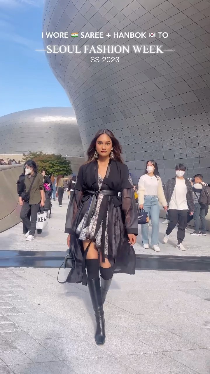 💥📣READ CAPTION 📣💥 Gotta officially make Hanbok-Saree a thing! 😌 (YES I WORE A DRAPE TO FASHION WEEK🙃) GO WATCH MY LATEST VIDEO TO CLEARLY SEE WHERE THE SAREE IS.☺️ (Also gonna put a few more posts from SFW so apologies in advance for the spam coming up lol) Special credits to @iiiyukiiiiiii for doing my makeup, making me look 🔥🔥 and also for the boots❤️ Love you YukiYukiii❤️ #seoulfashionweek #서울패션위크 #fashionweek #ss23 #SFW #패션 #서울 #한복 #saree #hanbok #india #korea #indianinkorea #indiakorea #browngirlinkorea #fashiondesigner #sareedraping #fashionshow #fashionreel #draping #fashion #fashioninspo #mysterypalette #aanchalaware