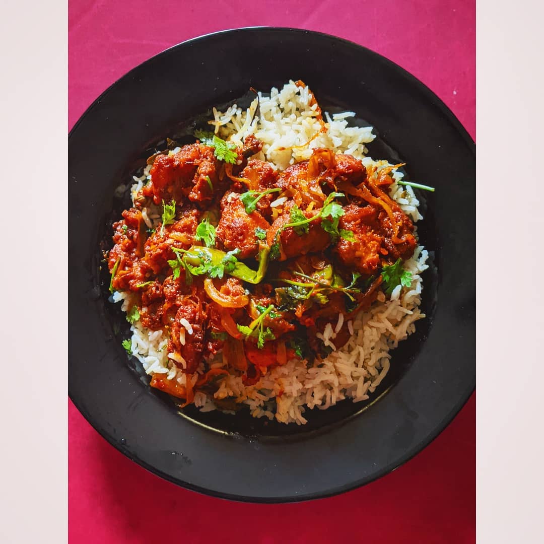 Special chicken biryani🔥🤤 Whether is very much demanding such an succulent chicken kabab biryani which is a boneless chicken biryani🍗 drooling!! The taste is next level though. You should definitely try this biryani. So let's quickly jump into the recipe All you need 🍗boneless chicken 🍗basmati 🍗spices(bay leaves, green cardamom, cloves, cinnamon stick, black cardamom) 🍗ginger garlic paste 🍗red chilli powder 🍗turmeric powder 🍗garam masala 🍗salt 🍗chilli sauce 🍗egg 🍗cornflour 🍗mint and corriander leaves 🍗onions 🍗green chilli 🍗tomatoes 🍗curd For marination: Marinate your boneless chicken with a tbsp ginger garlic paste, 2tsp chilli powder, 1tsp turmeric powder, 1tsp garam masala, salt to taste, 1tbsp cornflouer, 1egg and a pinch of red food coloring. Mix everything thoroughly and let set aside until then we will check on our rice For biryani: In an vessel, put 3tbsp oil and 2tbsp ghee let heat then add the spices mentioned above and let crackle. Then add a tbsp ginger garlic paste and cook it later some slit green chillies and give some quick stirs so that it wont stick to the bottom of the vessel and get burnt up. Then add fistful corriander and mint leaves, mix well then add some curd and stir quick, add salt to taste. To that, add your soaked basmati. And mix it carefully so that your rice wont break. Then add some yellow food coloring so that your pulav looks colorful. Pour water according to to the rice quantity. And let cook your pulav. For kabab: Its time to fry your chicken. In a kadai add some oil for deep fry. After you are done with deep frying your chicken, set them aside. And in the same oil add some sliced onions and 2slit green chillies and let fry till semi golden brown. Then add in a tbsp ginger garlic paste and cook till the rawness is gone. Now add a tsp turmeric powder, a tspred chilli powder, half tsp garam masala, very lil salt. Cook the masala then add puree of 2 to 3 tomatoes and give quick stirs and let cook. Now add your fried chicken to the gravy and mix. Add some coriander and mint leaves to it and mix. Now its time to serve, plate it with pulav and top it with the chicken. Tadaaa! Enjoy special chicken biryani❤