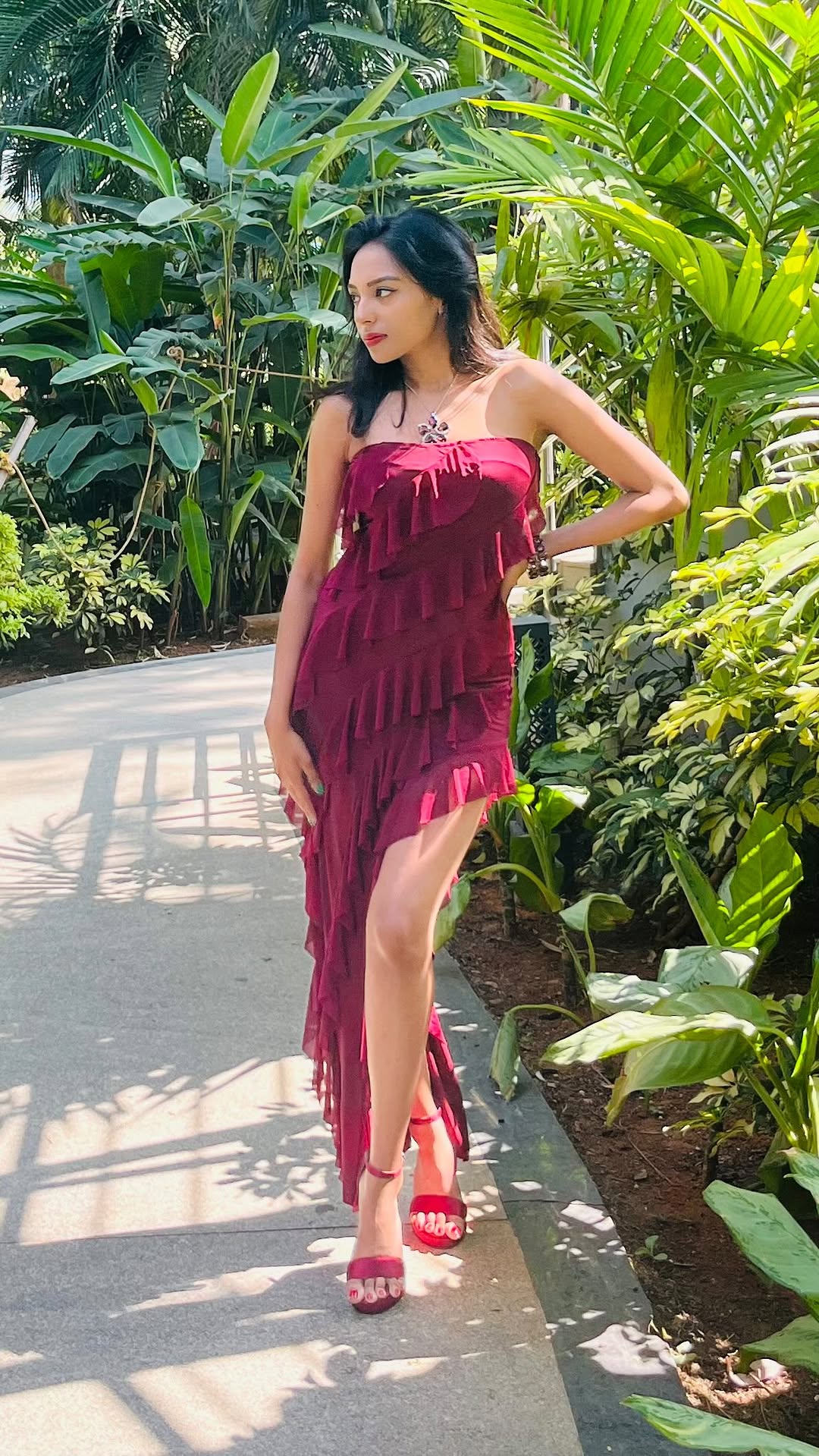 Besides, if they’re going to look— I might as well give them something to remember. . . . #photoshoot #outdoorshoot #ootd #fashionstyle #redoutfit #sideslit #poseguide #maroondress #gardenvibes #styleinspo #fashionphotography #gowndress