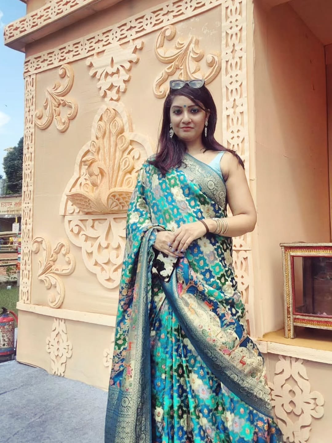Shoshthi morning look - in this stunning and vibrant Rangkat sari - a Pujo gift from my dear sis and sari connoisseur @bongchic32