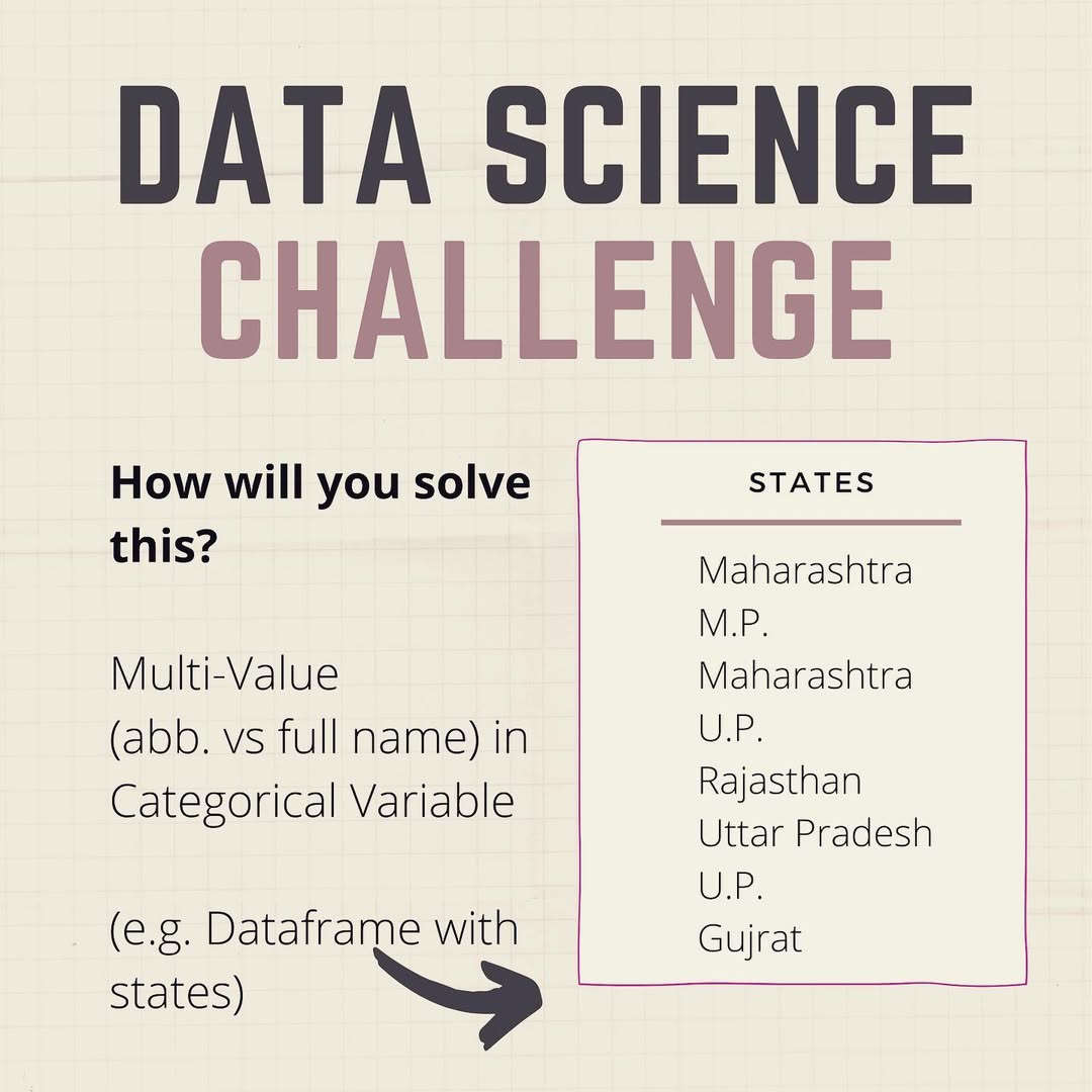 How would you solve? "Abbreviations in your Categorical Data". . They lead to data loss and outliers when you try to Label Encode or One Hot Encode them without intervention. . Comment your technique. . Check back tomorrow we'll share the unusual techniques answered by our Data Scientist across all our social media platforms . #keras #DSGupshup #machinelearning #datasciencebootcamp #datascience #datavisualization #dschallenge #bangalore #mumbai #kolkata #delhi
