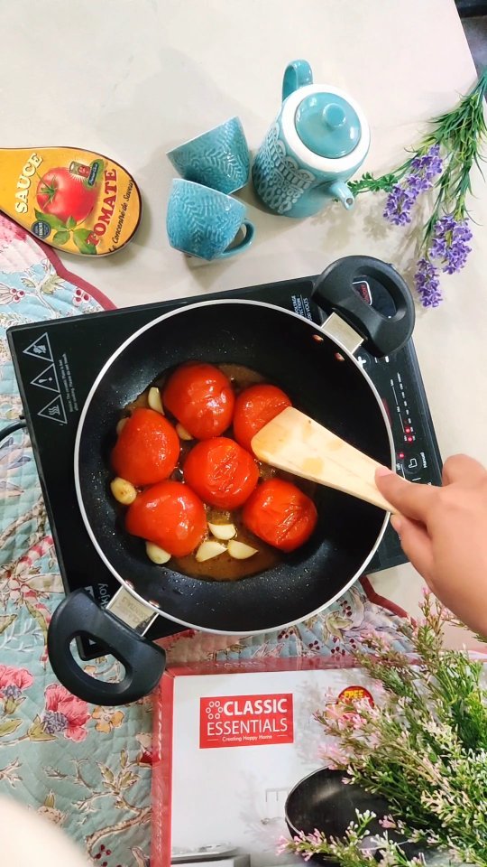 I had fun making this easy peasy tomato chutney using @classicessentials not stick kadai... Their range of premium nonstick cookware is super good to use and are made using food grade certified non toxic material and Comes with a real wood spatula. This range of cookware is induction, gas and halogen friendly too. The thick aluminium base ensures power saving and minimal oil cooking experience. 😍 Do try them out 😍😍 The recipe ingredients are: Oil - 1 tsp Garlic - 5-6 pods Tomato - 3 Salt to taste Red pepper - 1/2 tsp Onions - 1 Coriander - 2 tbsp #arvindkaurjain #arvindrecommends #classicessentials #classicessentialscookware #easytomatochuntey #tomatochutney