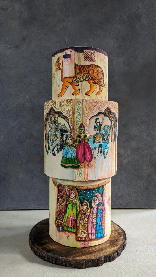 Rajasthani Elegance! Presenting our latest creation: a three-tier masterpiece inspired by the rich and vibrant culture of Rajasthan. Each tier is a canvas, hand-painted with intricate details capturing the essence of Rajasthani art—from the regal elephants and tigers to the graceful puppets and the majestic palaces. This cake is a feast for the eyes! Perfect for those who want to add a touch of tradition and artistry to their celebrations. #noidahomebakers #weddingcakesnoida #weddingcakesofinstagram