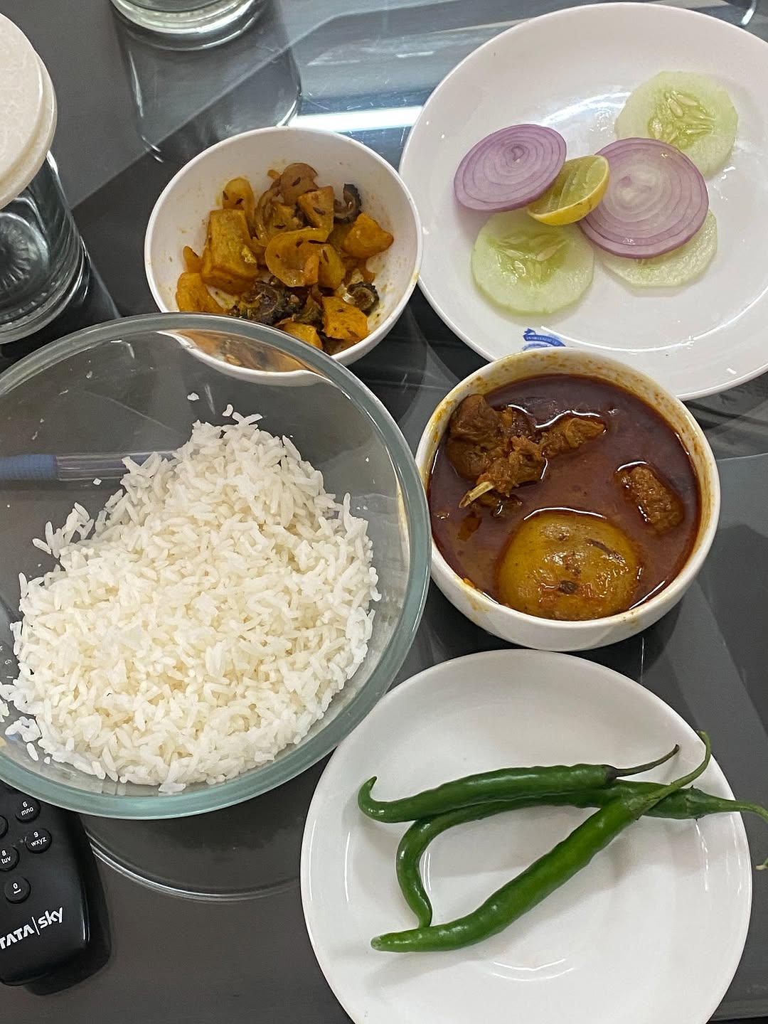 Dead tired after running last minute errands and packing/sorting the whole day as we transit from a regular apartment in Srinagar colony to a gated community in Kokapet. But just couldn’t resist posting this meal which we had for Sunday lunch : Bhaataw Au Aloo Mangsaw Tarkari, in other words the Odia version of Mutton curry made with big fat potatoes and some crisply fried Karela. I suspect the wait staffer who served us had the last laugh when he saw that we finished the fairly large bowl of rice after asking him to remove some of it! 😆Finger licking food and I’m proud to state that the cook at this guest house is Odia! Every single meal cooked by Ganesh is perfecto Can’t keep a good meal down, can you?