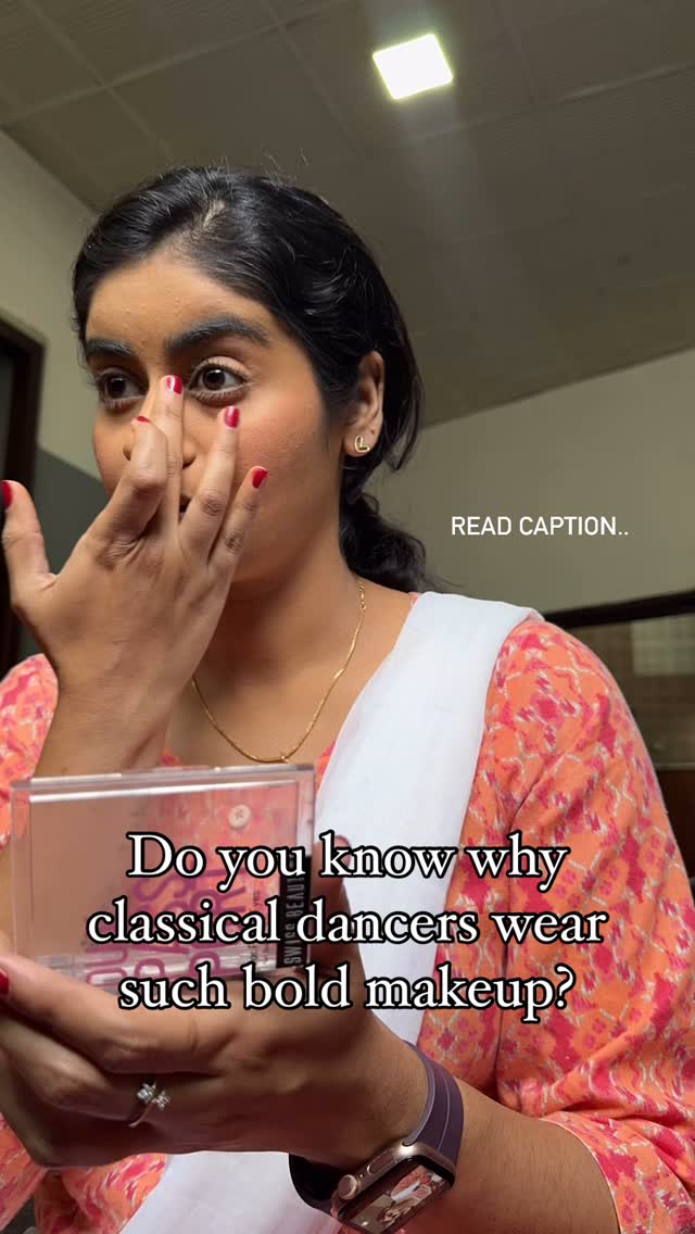 Okay, listen… Bold makeup in dance aren’t just for aesthetics. they help the audience sitting far away understand the intricate emotions and stories being told through abhinaya (expressions). Since I perform Bharatanatyam and Kathak majorly, I’ve noticed a key difference between the two when it comes to eye makeup specifically. The eye makeup for Kathak is more subtle compared to Bharatanatyam, and I always wondered why! At first, I thought it might just be a style choice, but then I realized it’s because of how the eyes are used in each form. In Bharatanatyam, our limbs can stay still while our eyes move dramatically to tell a story. Here, bold and exaggerated eye makeup is crucial to highlight those movements. But in Kathak, the principle of “yatho hasta thatho drishti” means the hands and eyes work together, and even the head moves along with the eyes. So, the focus isn’t solely on the eyes, and exaggerated eye makeup isn’t as necessary. It’s such an interesting distinction that reflects how makeup truly aligns with the style and storytelling of each dance form. . #classicaldance #BoldMakeup #Bharatanatyam #Kathak #IndianClassicalDance #MakeupSecrets #StageReady #Abhinaya #DanceLife #DancerGram #PerformersLife #DanceExpressions #TraditionAndArt #StorytellingThroughDance #IndianCulture #behindthescenes #bangalorediaries #rachnaamin