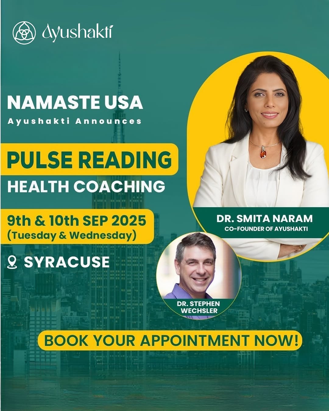 Namaste USA! 🌸 I am delighted to be in Syracuse on 9th & 10th September 2025 for a very special Pulse Reading Health Coaching session. 🌿💛 Through pulse reading, I will help you understand the root cause of health imbalances and guide you with personalized Ayurvedic solutions to bring back balance, energy, and well-being. ✨ 📅 Date: 9th & 10th September 2025 📍 Location: Syracuse, USA 🌿 Limited seats, so I invite you to book your appointment now and begin your journey to natural healing. 💚 #DrSmitaNaram #stephenwechsler #Ayushakti #pulsereading #holistichealing #ayurvedajourney #naturalhealing #wellnessjourney #healthylifestyle #wellness #syracuse #ayurveda