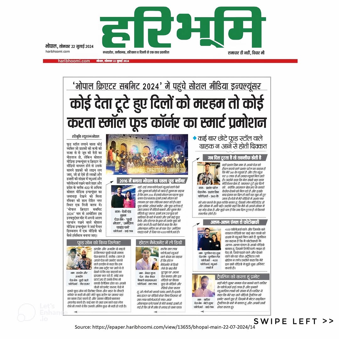 Honored to be featured in Haribhoomi! Yesterday’s Bhopal Creator Summit at @aceofclubs_bhopal was absolutely exuberant 🔥 Bringing together all the talented people from Bhopal under one roof was a fantastic experience. Huge congratulations to the @makclickz @bhopalcreatorssummit team for the superb arrangements, especially on such short notice. Special thanks to @update_bus_bhopal . Looking forward to many more incredible events in the future! #bhopalcreatorssummit #creatorssummit #creatorsbhopal #summit #featured