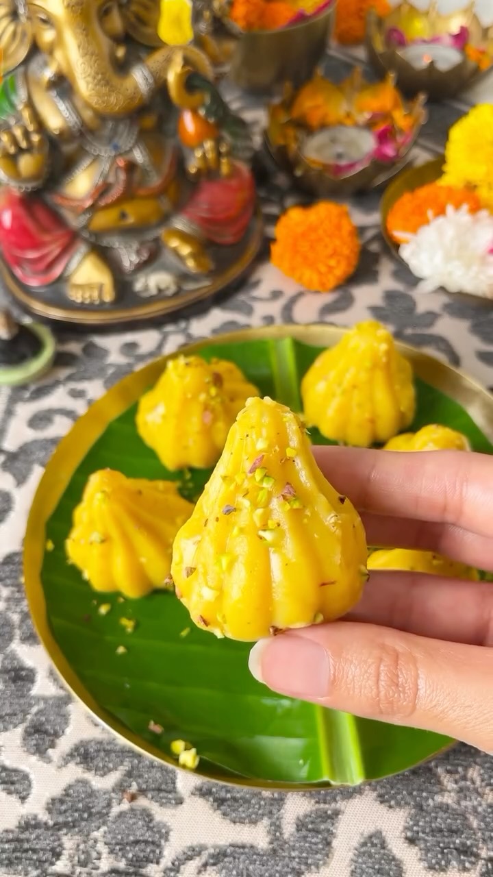 Modaks made at home taste sweeter—try making them this Ganesh Chaturthi 🥰 📝 Ingredients: 1 cup milk 1½ cups milk powder 1 tbsp ghee ¼ cup sugar ½ tsp elaichi (cardamom) powder Chopped nuts (almonds, pistachios) for garnish 😌Instructions: Pour in the milk and warm it slightly. Gradually add milk powder, stirring continuously to avoid lumps Add ghee. Keep stirring on low-medium heat until the mixture thickens and starts leaving the sides of the pan (about 8–10 minutes) Mix in the sugar and cardamom powder. Cook until the sugar dissolves completely and the mixture thickens again. Let the mixture cool just enough to handle Grease the modak mould with a little ghee. Stuff the mixture into the mould, press it well, then gently remove. Add a chopped pistachio or almond on top for a festive touch. (Ganesh Chaturthi modak recipe, How to make modak at home, Modak for Ganpati Bappa, Steamed modak recipe, Mawa modak for Ganesh Chaturthi, Traditional Indian sweets, Modak prasad for Ganesh Chaturthi, Easy modak recipe, Modak making at home, Bappa’s favorite sweet, Indian festival sweets, Homemade modak for Ganpati)