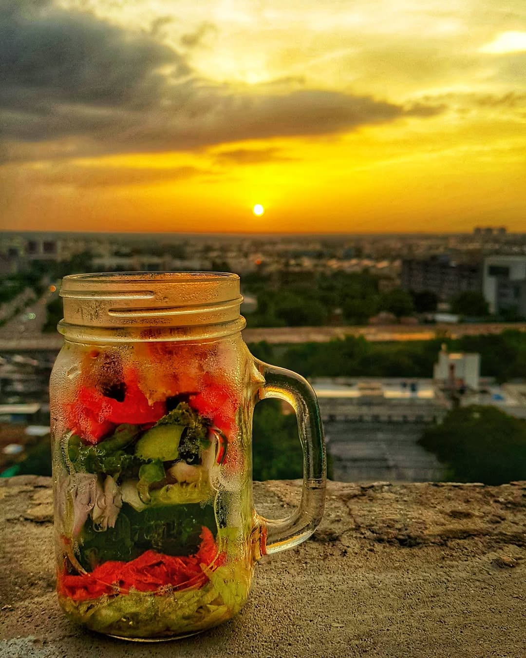 Lunch in a Jar Lunchtime at work can be annoying at times. Some colleagues want to go for unhealthy (junk) options or others want to grab something from the supermarket. But it's expensive and not exactly satisfying either. Of course bringing your own lunch to work is not the newest idea in the world, but this way of doing it is - healthy, time saving, money saving and really tasty. In theory you could prepare lunch for the whole work week in about 45 minutes on a Sunday. The only thing you need are 5 jars(or lunchboxes) and enough space in the refrigerator. The idea is pretty simple: Start with filling a dressing into the jar and then layer various ingredients like greens, veggies, rice and cheese or paneer on the top. Keep those jars in the fridge until you need them.Grab a bowl and empty the jar. The dressing will then cover the whole salad. Done che baka 🙂 @the.saladqueen Want to see more? Follow us now 👇 @foodliners Use our hashtag #foodliners to get featured. #salad #saladbowl #salads #saladrecipe #instagood #instafood #quickrecipes #quickmeals #saladideas #masonjar #saladjar #healthyfood #healthylifestyle #healthyeating #sunset #lunchtime #brunch #foodiesofahmedabad #amdavadism #jorrfood #bloggersofahmedabad #foodlove #saladporn #chalokhaiye