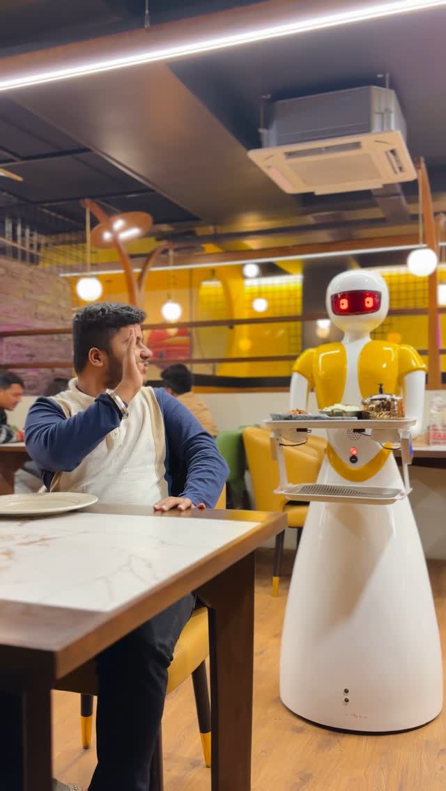 Food served by Robots! 😍 📍: @theyellowhouse.india Timing : 11:00am to 11:00pm [Robot, Food served by Robot, Culinary Experience, yummy food, good food, ruby, robotic restaurant, vadodara, gujarat, mocktail, chinese, mexican, continental, punjabi, mocktails]