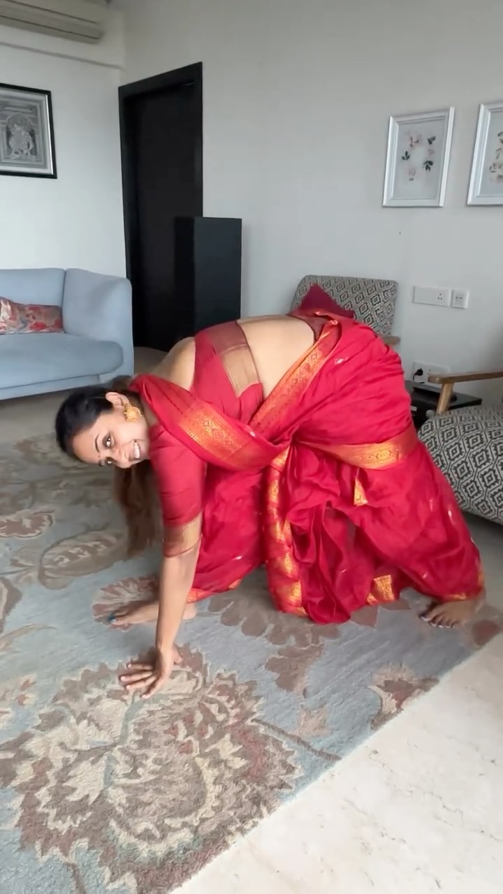 Let’s try this easy peasy #MondayFitnessChallenge or wait is it so easy 🧐? That’s for me to know and you to find out🙃! Rules - The hands should not leave the floor. Don’t move the legs. The nose shoudi touch the knee, the knees to be straight. Hi, I am Prerna, a 47-year-old yoga teacher who loves taking these challenges in sarees and bringing the much needed attention to this beautiful garment. Follow me for more such challenges every Monday. [Monday fitness challenges, MaaOfAllBlogs, prerna Sinha, saree yoga, yoga in saree, saree yoga challenge ]