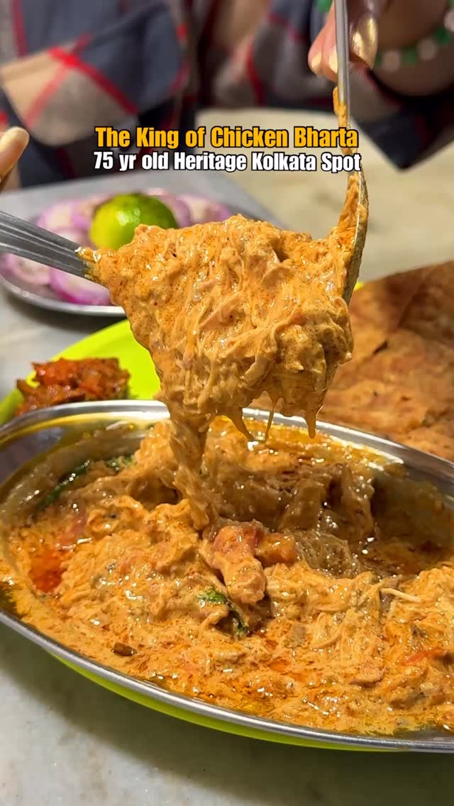 75 years of Kolkata’s OG Chicken Bharta! 👑⁣ Far from fancy cafes — Russell Punjabi Dhaba (formerly Bharat Hindu Hotel) sits at 41, Chowringhee Road, near the Russell-Middleton Street crossing, Park Street / Russel Street area, Kolkata. 🕰️ Open daily from 7:00 AM to 12:30 AM Here’s why this place is a Kolkata legend: • Bharta that rules the city 👑 • Hot aloo parathas with butter & roti servings • Chai that’s part of the ritual, samosa that surprises you • And that final sip of lassi that takes you home Tag your bharta buddies, plan your next Kolkata food crawl — this is the dhaba to visit when you want food that tells stories. ✨ [ chicken bharta , kolkata food , street food , indian dhaba , heritage of kolkata , foodie ]