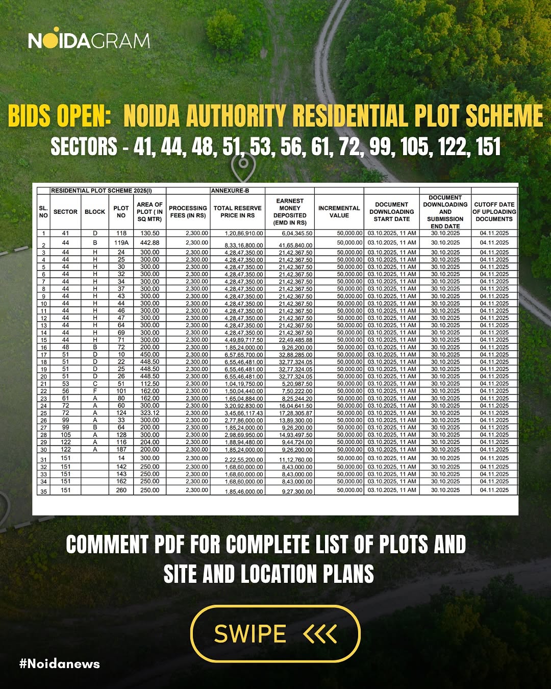 Big news for Noida plot hunters! Noida Authority has rolled out its Residential Plot Scheme 2025(I) — and the e-auction window is now LIVE. 🏡 Plots are up for grabs across prime sectors, available on an “As Is Where Is” basis. Fair bidding, full transparency — and your chance to finally own a slice of Noida. 📅 Important Dates: 🔹 Scheme Opens – 3rd Oct 2025, 11 AM 🔹 EMD & Document Submission – 30th Oct 2025 🔹 Results – Early November 2025 💻 How to Apply: Head to 👉 noidaauthorityonline.in → Land Allotment → Live Land Allotment Schemes Register, deposit your EMD, upload docs, and get ready to bid! ✨ Don’t miss it — because this Diwali, the best investment might just be a plot of your own. #NoidaAuthority #NoidaRealEstate #Noidagram #NoidaUpdates #NoidaProperty #NoidaPlots #NoidaNews #NoidaDevelopment