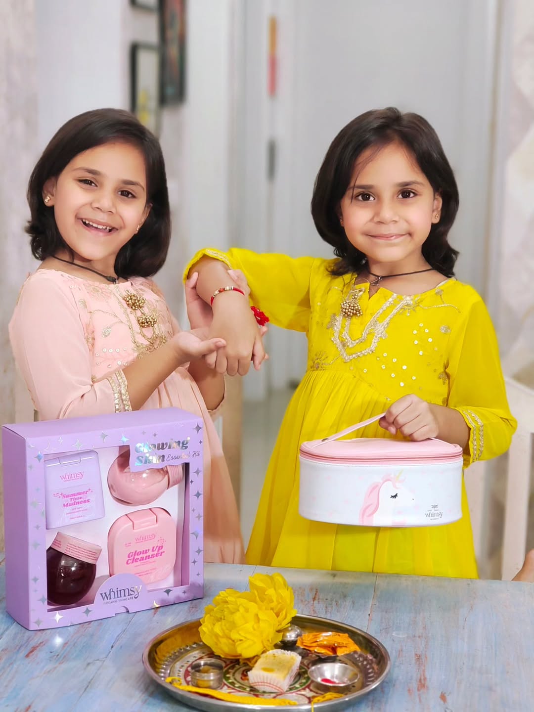 I got stunned! When these girls choose to gift each other @thewhimsybeauty Unicorn make up kit & Glowing Skin Essential kit.🎁💝 Such an ideal gifting solution to nourish and glow the little ones up! 🌟🎁 Who doesn't know about Whimsy Beauty! It's India's first makeup brand for kids & teens. The uniquely formulated beauty enhancers are designed to unleash your child's inner magic and express their true selves. 🎈💝 The products are best for the kids because these are cruelty free and have no harsh chemicals that makes it the first choice for parents too for their little young girls.🌟🎈 Still thinking of Rakshabandhan gift! Grab it now! Available on Whimsy Beauty website, Nykaa, Amazon, Myntra etc. Happy Gifting 🎈 💝 #giftingideas #rakhigifting #rakhshabadhan #rakhispecial #rakhshabandhanspecial #thewhimsybeauty #makeupteens #preteens [RakhiGifts Rakhi Gifting Ideas, Preteens makeup, Preteens skincare, ideal gifting, gifting for sisters]