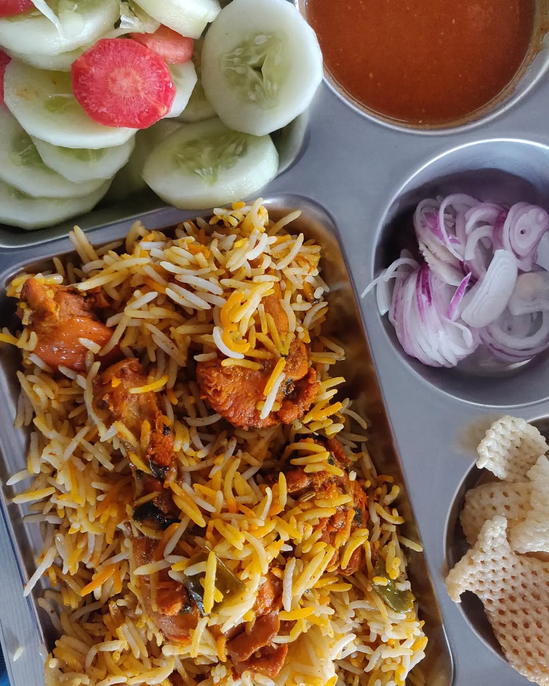Wednesday Lunch Scene be like 🤭 . In frame - Chicken Biryani, Salan, Salad, Fryums 💰Price - ₹100/- (500grams) 🖊️Rating - 3.8/5 . #biryani #chicken #indianfood #chinesefood #food #foodie #whatsonmyplate #indianfoodblogger #foodiesofbhubaneswar
