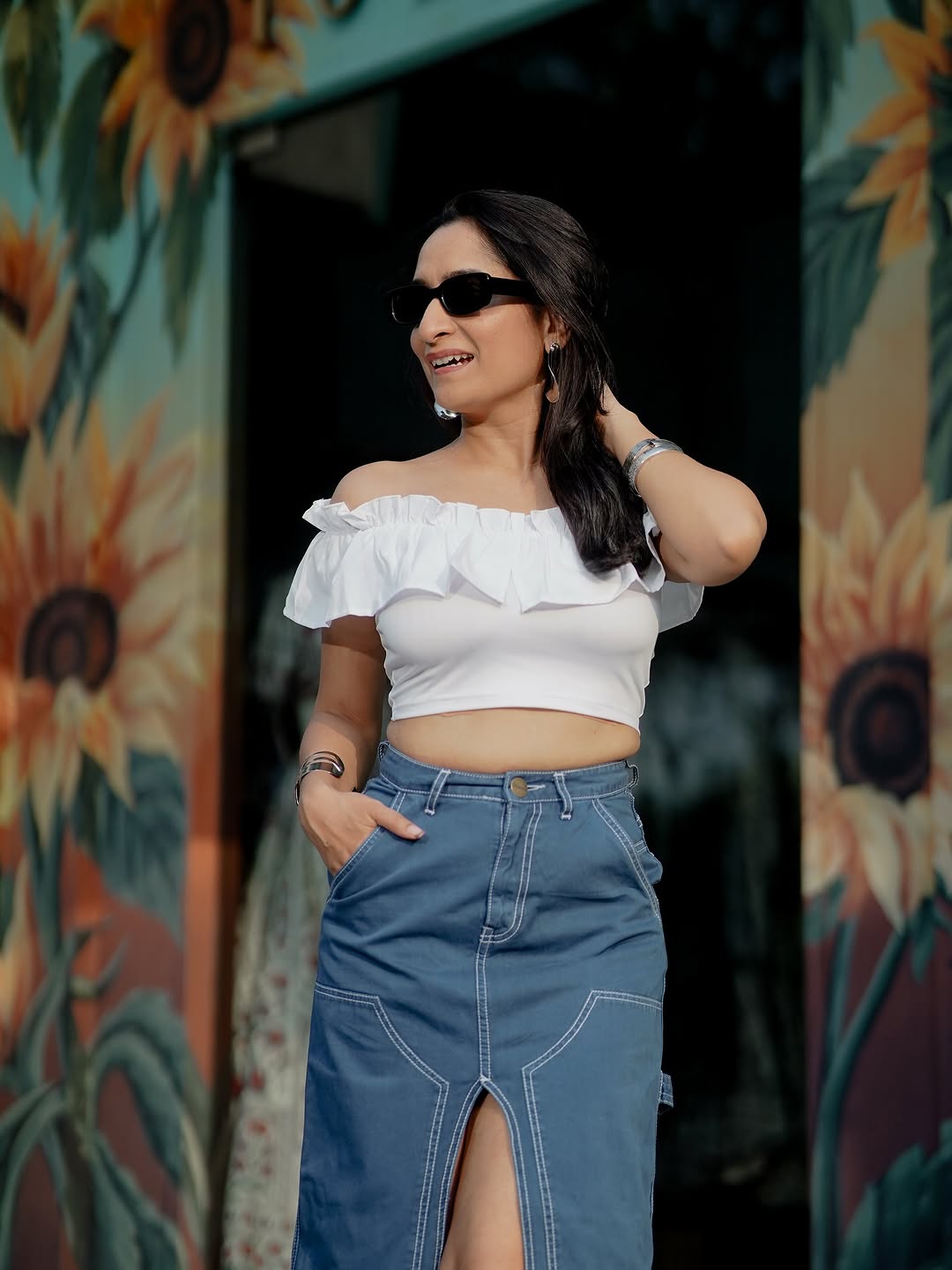 An Off shoulder summer white + front slit denim FTW Thoughts? Top @newme.asia Skirt @freakinsindia Shot by @shaantanu_bhatt_photography (Off shoulder, white top, denim skirt, white, summer)