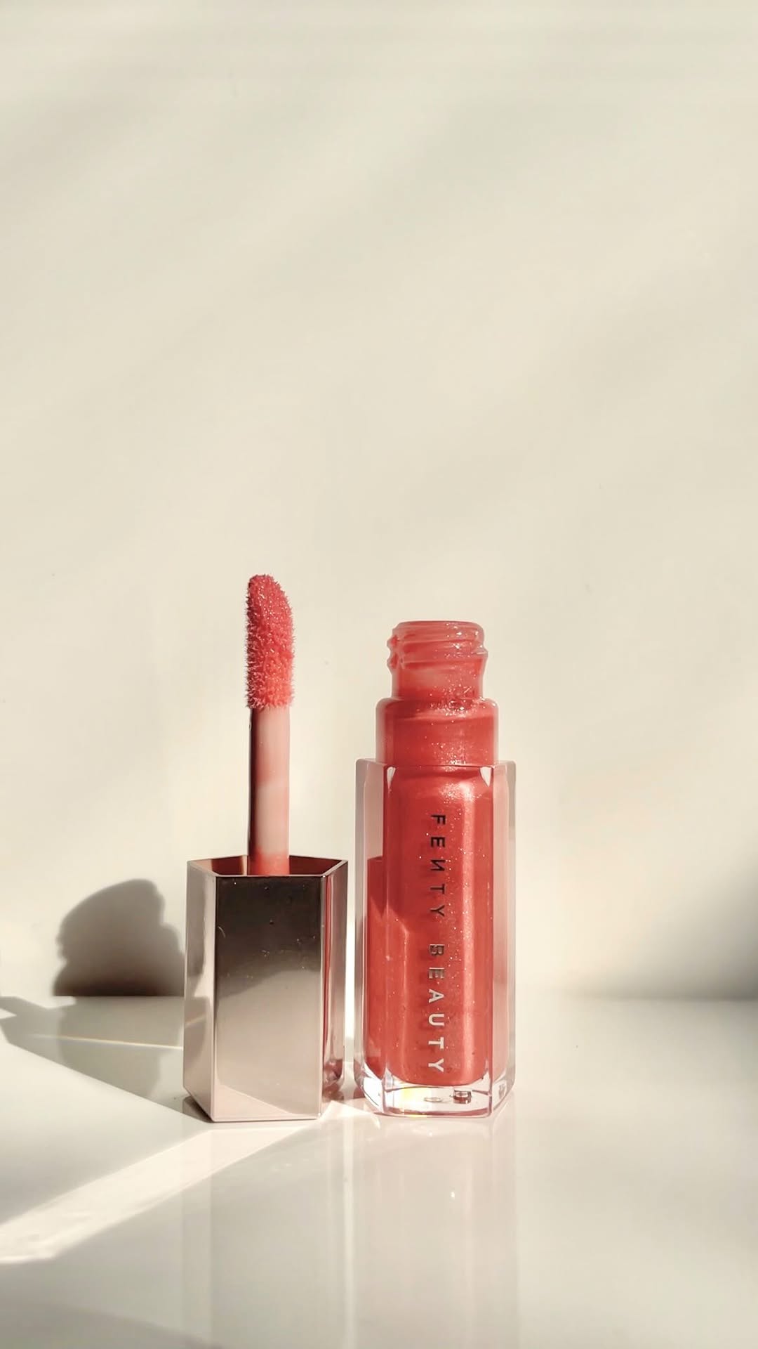 FENTY BEAUTY GLOSS BOMB UNIVERSAL LIP LUMINIZER In the shade: Fu$$y (shimmering dusty pink) The formula is smooth and non-sticky. One of my favourite lip glosses! 💕 #fentybeauty #fentybeautybyrihanna #fentybeautyglossbomb #lipgloss