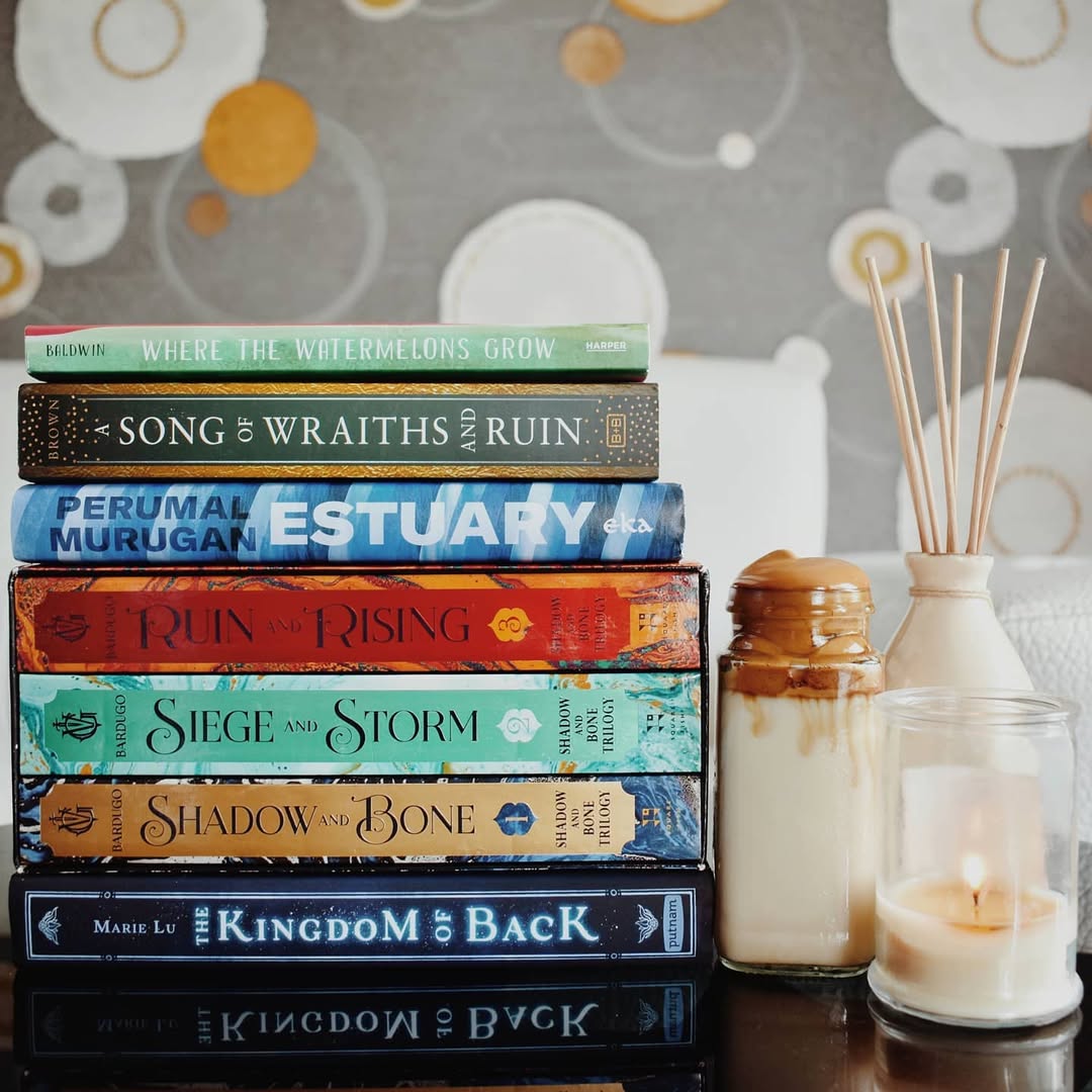 QOTD: What was your favourite bookish buy of August? . August bookhaul 📚 August was a month of anxiety ridden days for me, but some of my days were made better by bookmail. 📘: Estuary by Perumal Murugan is a book that has been on my radar as I have enjoyed one of his previous works, and thanks to @broke.bibliophile I snagged a copy during a crazy online deal. 📗: Where the Watermelons Grow by Cindy Baldwin is an intriguing middle grade fiction and one I'd pre-ordered. It's been a while since I read a mg and I'm looking forward to it. 📙: A Song of Wraiths and Ruin by Roseanne A. Brown is another pre-order. I have been exited to get my hands on it ever since I read its blurb and I'm hoping to pick it up soon. 📚: The Grisha Trilogy by Leigh Bardugo has been sitting in my cart for a while now and I'd been waiting for a price drop. One fine morning, as soon as I woke up, I casually checked my Amazon cart to check for any price drops and lo and behold the boxset was available for an absolutely amazing price and I immediately grabbed a set. I'm also proud to inform you that I found this deal before even Broke did. (😂) 📘: Kingdom of Back by Marie Lu: A book about the other Mozart? Sign me up! I have been excited to get my hands on this book ever since I found out about it, I immediately pre-ordered it and I'm thrilled that I finally have it. . I hope to get to these books as soon as I can but, my mounting tbr and my ever changing reading mood might hinder that, I'll still try my best though. 😆 Let me know if any of these books are on your tbr or if you've read any. ❤️