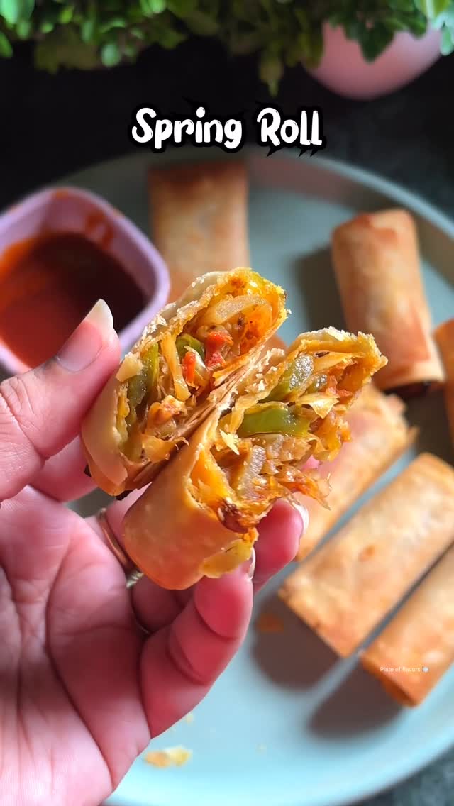Spring Roll . . Filling Preparation 1. Heat 2 tbsp oil in a pan. 2. Add Jeera, garlic and onion, sauté for a few seconds. 3. Add cabbage, tomatoes , and capsicum. Stir-fry on high flame for 2–3 minutes (keep them slightly crunchy). 4. Add salt, Haldi, chilli powder,Few spices,black pepper, chilli ,tomato sauce, and vinegar. Mix well. 5. Turn off the flame and let the filling cool down. ⸻ Making the Rolls 1. Take one spring roll sheet but i have used samosa sheet and place some filling on one side. 2. Roll it tightly while folding the sides. 3. Apply the maida slurry at the edge to seal it properly. 4. Repeat the same with all sheets. . For frying i am using air fryer. It took 15 min for 180C . Ut turned out crispy yet tasty 😛 Do try . [Spring roll, samosa, tasty food, yummy food, snacks, breakfast, 5 min easy recipe, Indian cuisine, spring roll, cabbage roll, fresh food, air fryer recipe, healthy snacks, healthy food]