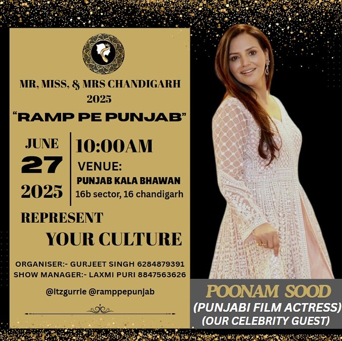 OUR CELEBRITY GUEST @officialpoonamsood ORGANISER @itzgurrie . . . Mr. Miss & Mrs Chandigarh 2025 RAMP PE PUNJAB “REPRESENT YOUR CULTURE” Under 5 years Under 9 years - (Mr & Miss) 10 to 16 - (Mr & Miss) 17+ - (Mr & Miss) 30+ - (Mrs category) GRAND FINALE ROUND 🛑RAMP WALK 🛑INTRODUCTION 🛑WALK WITH REPRESENT YOUR CULTURE DRESS 🛑Q/A ROUND 📍VENUE :- PUNJAB KALA BHAWAN, CHANDIGARH DATE:- 27.06.25 Makeup and Hair style provide by us ... Food Coupon for all participants .... Trophy for all participants.. Certificate for all participants... Crown for Top 7 Contestant Refreshments for all participants... Rehearsal for all participants... Photoshoot for all participants... Award by celebrity for all participants or our finaliest... 🛑Big Crown , Big Trophy, Gifts, Sash and Shoots for Winners. GURJEET SINGH FASHION MODELING JUDGE, ACTOR & GROOMER. SHOW ORGANISER & DIRECTOR 6284879391 SHOW MANAGER 8847563626