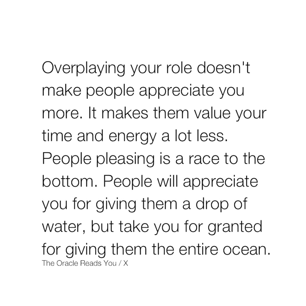 | had to learn this the hard way. The more you give without limits, the more people come to expect it-without gratitude, without reciprocity. Overextending doesn’t earn you more love or respect; it just makes people comfortable with your self-sacrifice. Now, I give intentionally, not endlessly. A drop of water to the right people means more than an entire ocean to the ungrateful.