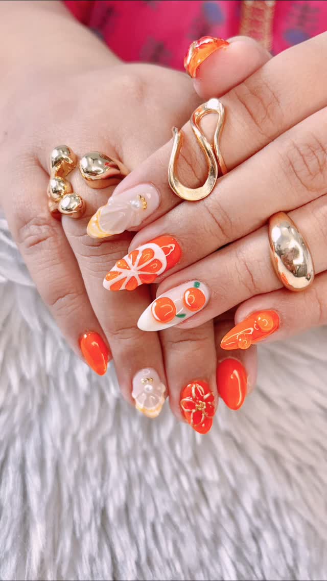 The best inspiration to reality nails transition ever! 🍊 Serving citrus vibes with glossy overlays & 3D art ✨ Beautifully done by my nail artist - @nailswag_by_payal . Products used- @blueskyindia @shills_professional . . . . . . [ orange nails, 3d nail art, soft gel, nail overlays, citrusy nails, inspiration, reality, nails transition ] . . #orangenails #citrusvibes #3dnails #geloverlays #orangeaesthetic #nailartinspo #beautyeditbyamy #sᴜᴍᴍᴇʀɴᴀɪʟs #nailgamestrong #nailsdesign #nailstransformation