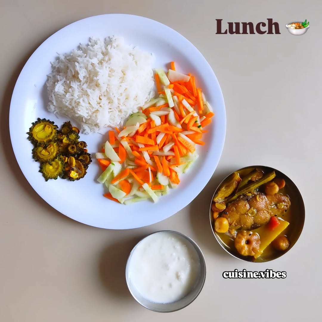 🌻 Simple yet Soulful Lunch Platter 💚 🌻 Homemade food is always a blessing! 💚 Rice Bitter gourd Salad Fish curry with veggies Curd #lunchidea #bengalilunch #fishcurry #homemadefood