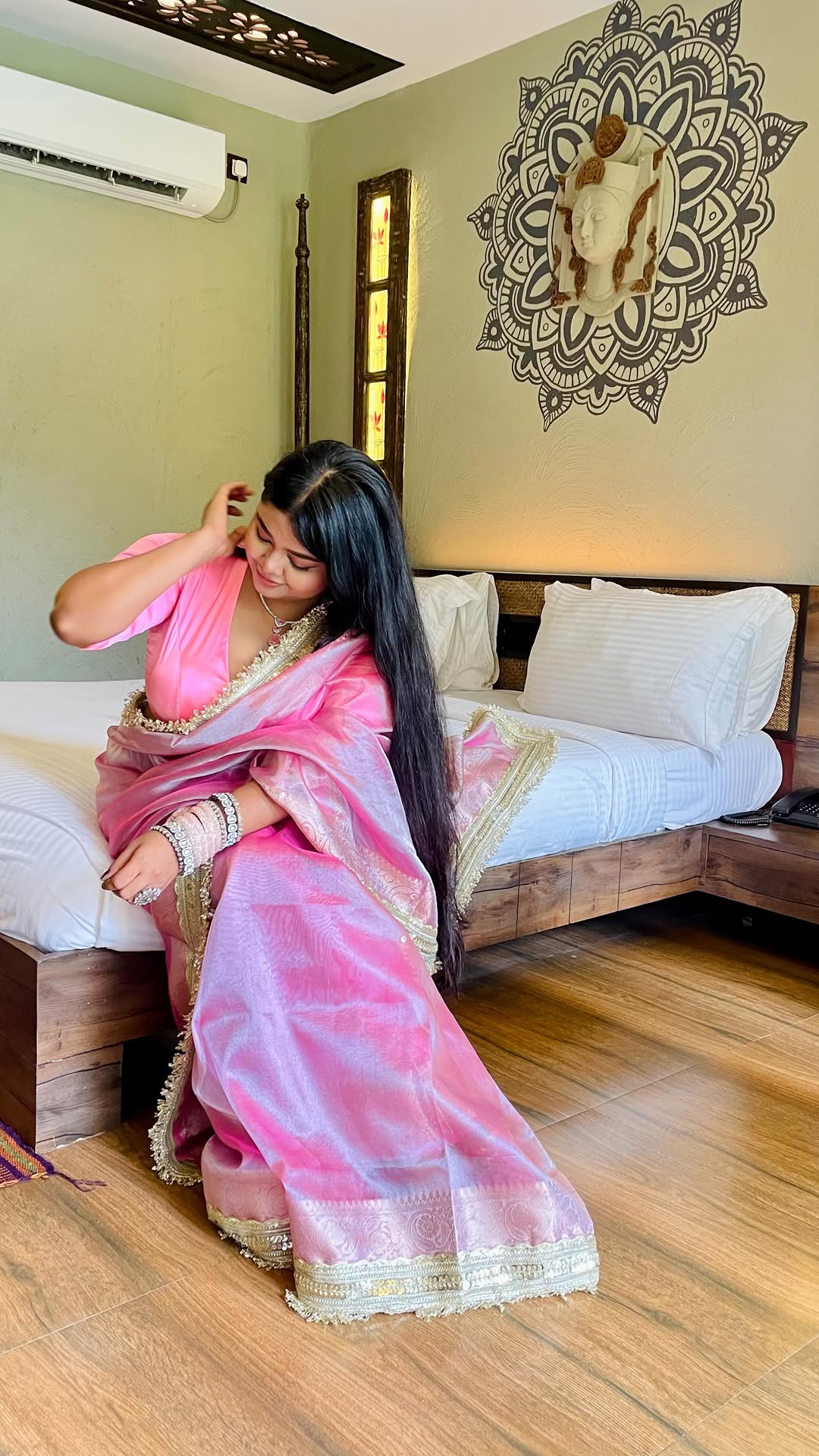 Blush tones and golden threads - some mornings deserve a little extra sparkle. 💖 Tissue silk sarees are all over the Internet and this light pink tissue silk saree with delicate gotapatti work feels like a celebration in itself. Be it a wedding ceremony or a breezy resort escape…… this sari from @azra_silk_fabrics goes where the mood takes me. Effortless elegance, always on repeat.🫶