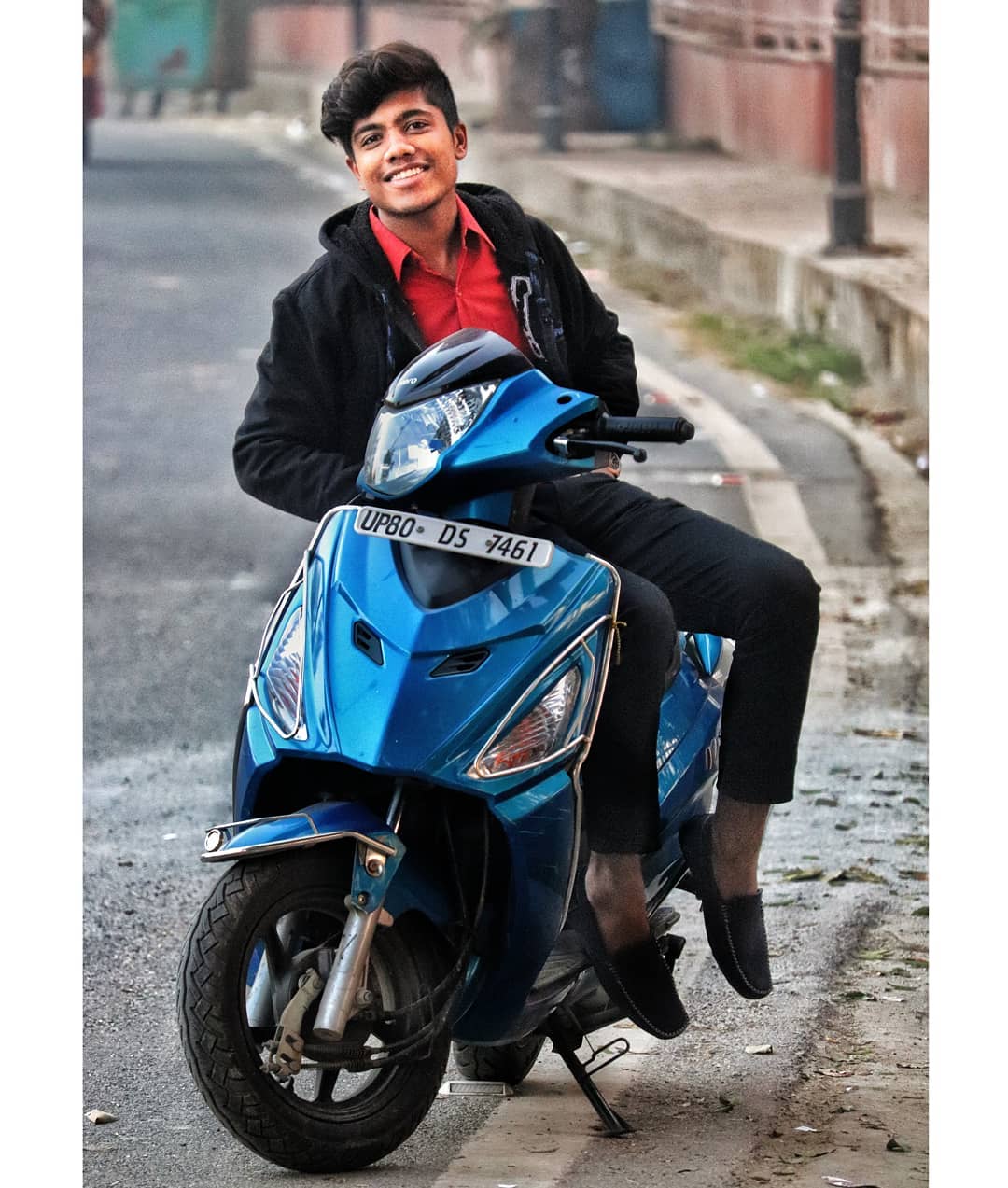 Tu keha hass main hansda reha..😊❤️ . . . . . . . #followformoreupdates #followforfollowbacknow #likesforfollowers #likeforfollow #pose #smile #jacket #blackwithred #activa #maestroedge #blue #hairstyle #fashioninfluencer #modelife #picofthedayindia #tagmangoinfluencer #@tagmangoofficial #stylefashion #starboynation🌙 #mayanksharma #mayankfam #fashionboi #creativeboi #mayanking #mayankingdom