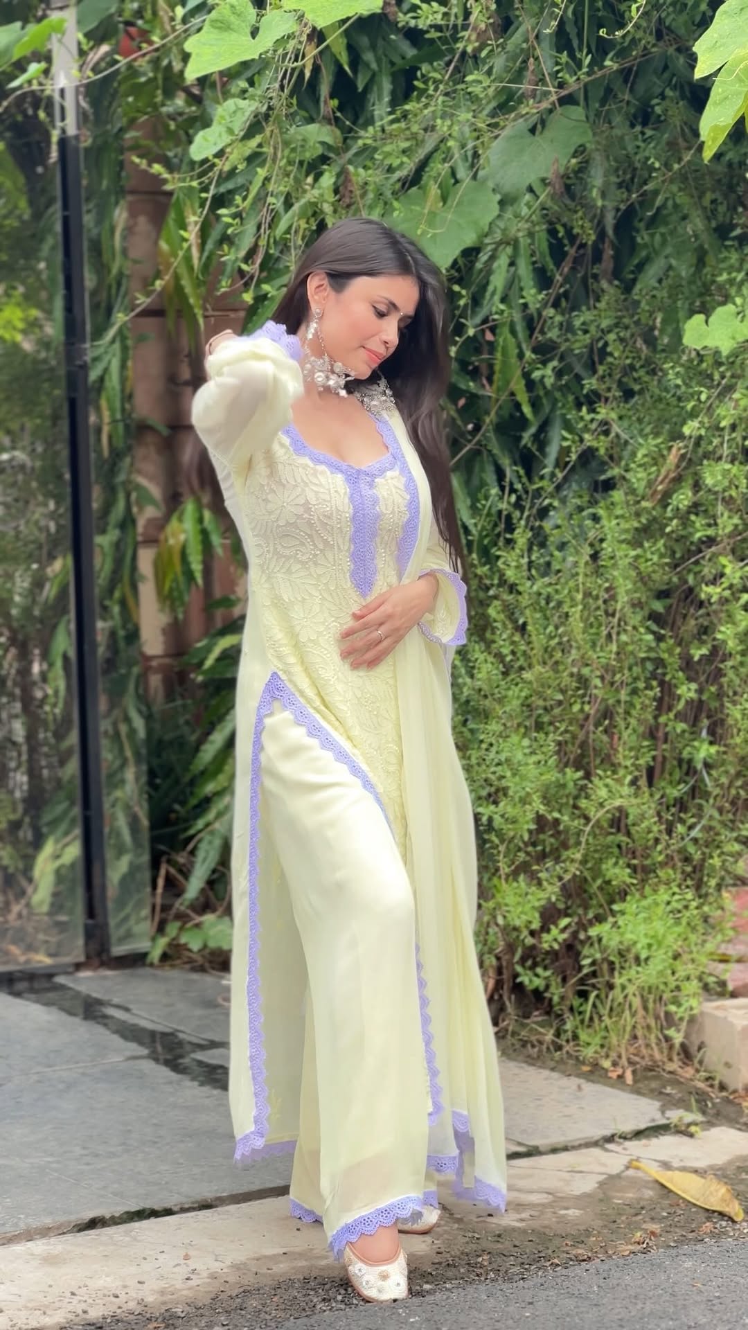 This suit is so subtle yet so classy! 🩵🩵🩵🩵 Loved wearing @labelaishwaryrika 💛 Comments for links 🩵 [grwm, chikankari, chikankarisuit, butteryellow]