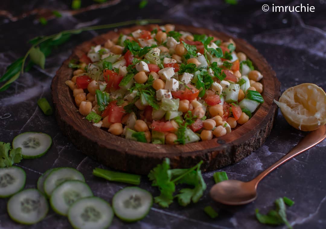 Chickpea Salad🥗 perfect for a quick brunch. High in protein, minerals ,& fiber Ingredients...... (1) socked and boiled kabuli chana (white chickpea)1 cup (2) Paneer ( cottage cheese) cubes 3/4 cup (3) Tomato cubes 1/2 cup (4) finely chopped green spring onion 1/4 cup (5) finely chopped parsley 2 tbsp (6) Salt and black pepper powder to taste To be mixed into dressing (1) Olive oil 11/2 tbsp (2) Lemon juice 1 tbsp (3) Salt and black pepper powder to taste (4) Red chilli flakes 1tsp (5) Finely chopped garlic 1TSP (6) cucumber cut in small pieces 1cup Method (1) Combine the chickpea, paneer, tomatoes, black paper, spring onion and prepare the dressing in a bowl and mix well.... (2) Add the olive oil, Salt, black pepper, Red chilli flakes and mix well... Put this in refrigerator for atleast one hour and serve chilled...... . . Follow @imruchie Follow @imruchie . . . #healthybite #salad #saladrecipe #salads #healthy #healthyfood #paneer #paneerrecipes #chickpeas #foodbloggers #food #foodaddict #foods4thought #foodinspiration #foodphotography #foodinspiration #foodforfoodies #foodoholic #foodstyling #foodpornography #foodgasm #foodtruck #foodfeed #foodphotography #foodtrip #foodofinsta #foodlover #nikon #nikonfood @nikonindiaofficial