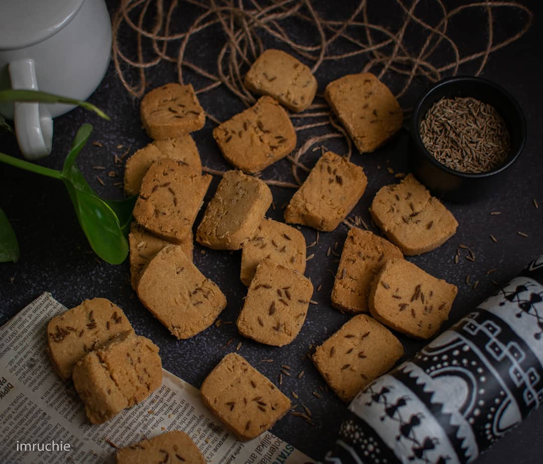In Frame Cumin/ Jeera cookies-A very simple very addictive and packed with aromatic cumin seeds. Made with wheat flour and doesn't contain sugar or jaggery for sweetness. The recipe is a savoury cookies and the only salt is used for the taste. Ingredients- 1. Butter or Ghee - 100 gm 2. Wheat flour - 200 gm 3. Baking soda - 1/4 TSP 4. Baking powder - 1/2 TSP 5. Cumin/Jeera - 1Tbsp 6. Salt - 1/2 TSP 7. Warm milk - 4 Tbsp or as required for binding the dough Recipe- 1- In a mixing bowl take all the dry ingredients and whisk together until well combined. 2- add ghee and using your hand mix it with the flour mixture. mix to a crumble texture. 3- add 4 tbsn milk and start to prepare the dough. 4- Do not knead the dough just combine together. 5-Shape the dough into cylinder long. 6- Wrap in clip wrap and refrigerate for 20 minutes. 7- Cut into slice and palce on the baking tray. 8- preheat the OTG and bake at 180 degree celcius for 20 minutes. 9- Store the cookies in an airtight container. Enjoy the salty cumin cookies with tea or coffee.... . . . So here is my contribution to #rangowalinavratri(Yellow Theme) hosted by @bliss_is_food @vegrasoidelights @rum_and_whisk @_dish_Of_flavours_ @panksplatter and @lisamasam_authentic_kitchen A virtual celebration of Navratri ✨✨ . . . Follow @imruchie Follow @imruchie . . . #cookies #biscuits #healthyrecipe #healthy #teatime #healthybite #cookiesofinstagram #ndtvfood #pinterestfood #pinterest #foodblogger #snacktime #healthfood #foodpost #healthyrecipes #cookies #foidstyling #foodphotography #foodaddict #foodforfoodies #foodpage #foodie #foodphotos #indianfood #foodnetwork #homemadefood #homemadecookies