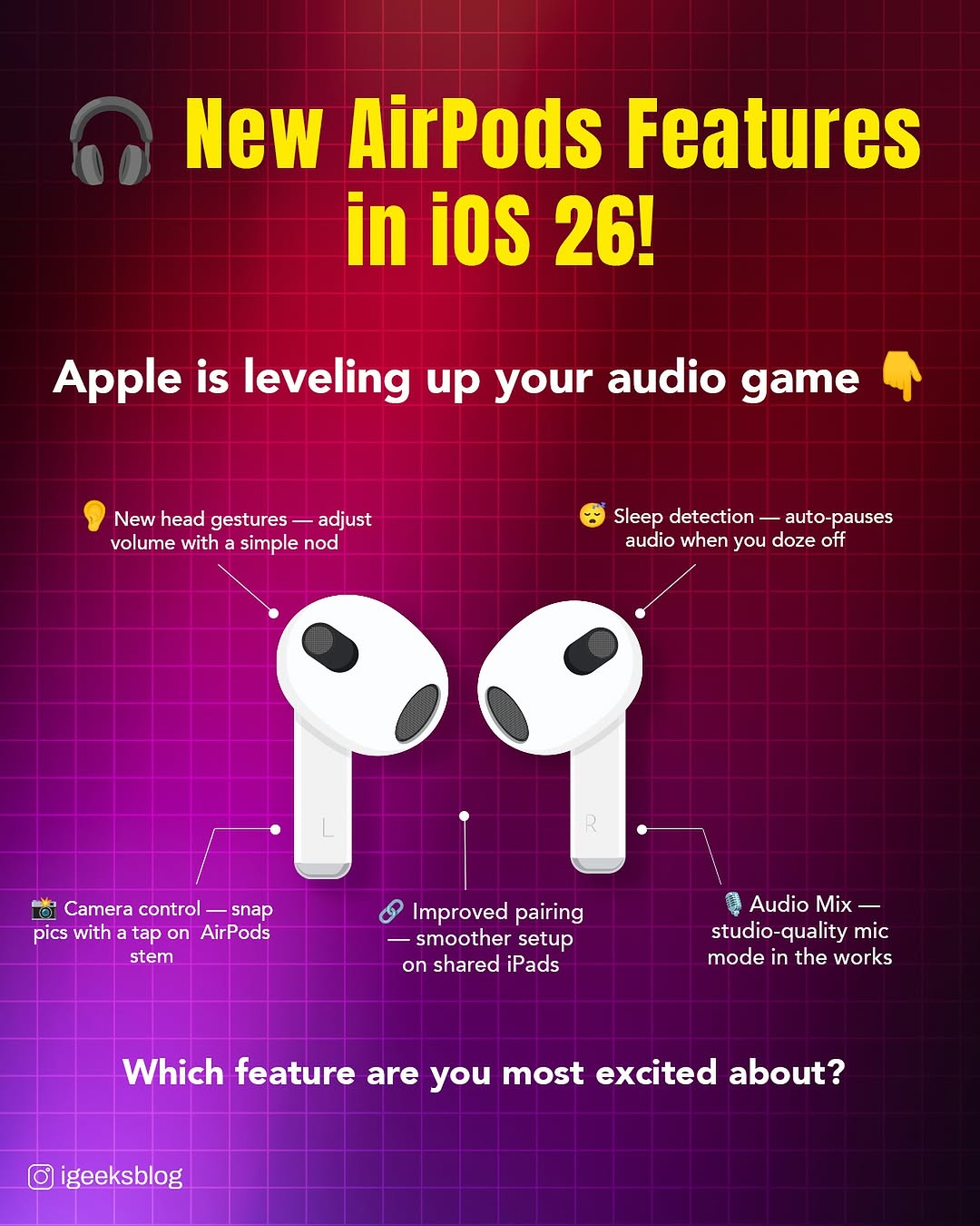 This post was published on 06th June, 2025 by Igeeks on his Instagram handle "@igeeksblog (iGeeksBlog - Everything Apple )". Igeeks has total 270.3K followers on Instagram and has a total of 3.7K post.This post has received 572 Likes which are lower than the average likes that Igeeks gets. Igeeks receives an average engagement rate of 0.31% per post on Instagram. This post has received 5 comments which are lower than the average comments that Igeeks gets. Overall the engagement rate for this post was lower than the average for the profile. #airpodspro #iphone #airpods #apple #features #ios26 #wwdc25 #appleevent #ios19 #leaks has been used frequently in this Post.
