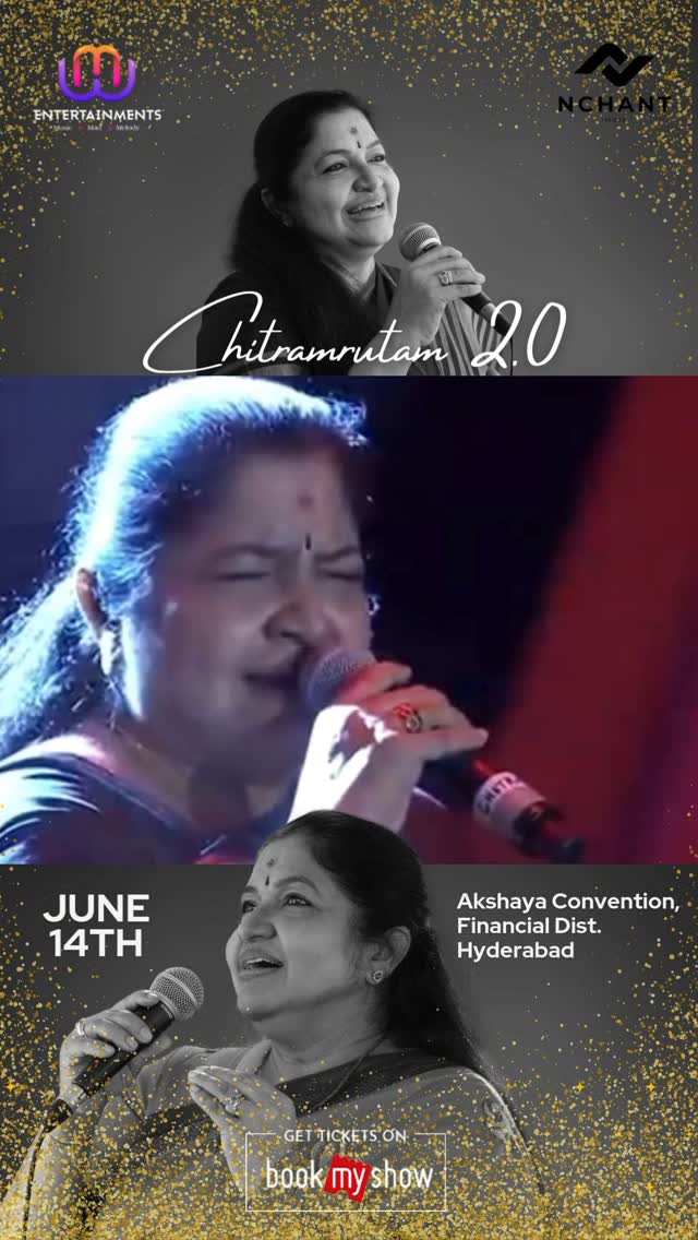 CHITHRAMRUTAM 2.0 ✨🎶 Get ready for a magical evening with the one and only Chitramma – celebrating 45 years of her legendary musical journey! An unforgettable night of melodies, memories & magic awaits you! 📅 Date: June 14th 📍 Venue: Akshaya Convention, Financial District, Hyderabad Get your tickets on BookMyShow Don’t miss this soulful celebration! #Chithramrutam2 #KSChithraLive #45YearsOfChithra #QueenOfMelody #LiveConcertHyderabad #HyderabadEvents #TeluguMusic #MusicLegend #AkshayaConvention #hyderabad #happeninghyderabad #telangananews #hyderabadconcert