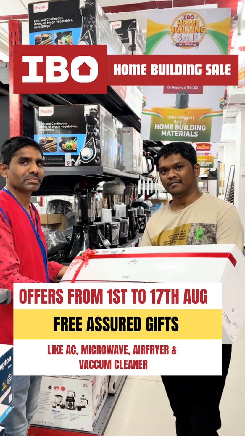 Smart folks are shopping at IBO right now. Why? Because India’s BIGGEST Home Building Sale is live — Up to 60% OFF on tiles, paint, plywood & more. And the coolest part? You get Assured Gifts like Air Fryers, Microwaves, even an AC. No coupons. No lottery. Just shop & take it home. Hurry! Sale ends on August 17th. #ibostores #homebuilding #homebuildingsale #August #independenceday #ibo #hardware #interior #building #IBOBGroad #hyderabad #hyderabadlocals #happeninghyderabad #hyderabadoffers