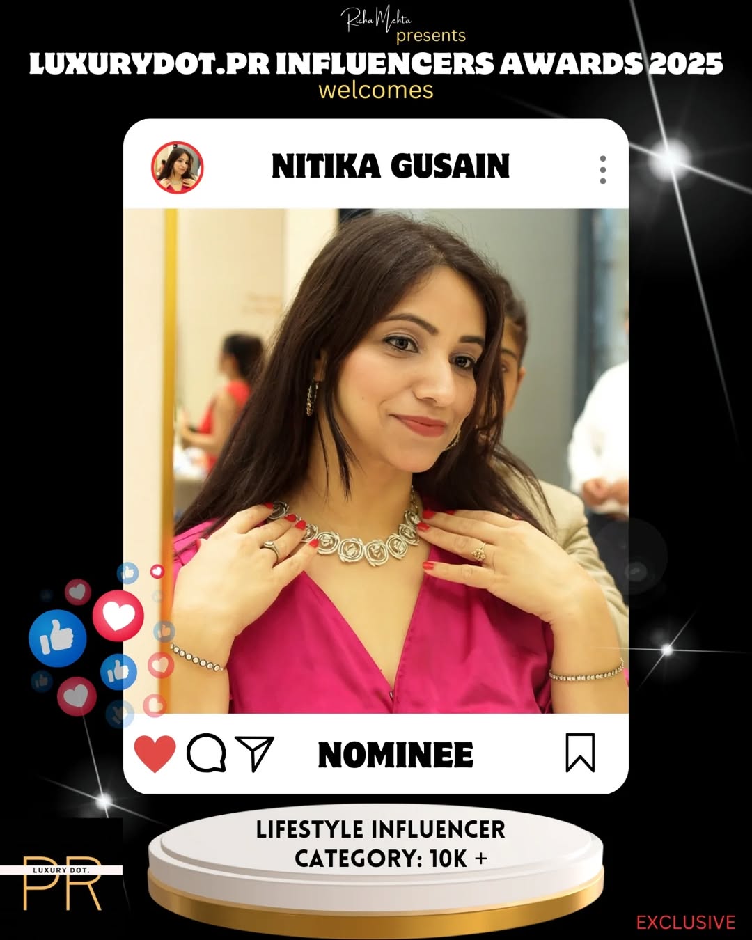 All the best, @nitika.gusain1827 , on your nomination for the "LuxuryDot.PR Awards 2025"—the most authentic awards by the award-winning PR firm!! Rules & Regulations TO GET SHORTLISTED for the next round (Please note-All rules are mandatory to be followed. Skipping even one will reduce the chances of being shortlisted): 1.Follow LuxuryDot.PR and Richa Mehta on Instagram (Mandatory to count your entry): https://www.instagram.com/luxurydot.pr_official and https://www.instagram.com/richa_mehta , the software will automatically pick entries from these accounts. 2. Like, save, and re-share the official post once we upload your poster. The more you engage, the higher your chances of winning. Points will be calculated based on your engagement, which we thoroughly review to ensure it is genuine and not generated by bots or fake accounts. This is a high-profile event held once a year, with a rigorous year-long process to determine the best Influencer(s). 3.Tag as many people as you can in the comments. Each comment with 3 tags and them following both the accounts equals 10 points. Creating multiple entries by tagging different people increases your chances of winning. <The maximum nominees won last year are through this only> 4. Share the post on your story and tag @luxurydot.pr_official & @richa_mehta. More re-shares = more points! 5. Use relevant hashtags #LuxuryDotPrAwards2025, #luxurydotpr , #richamehta for the engagement to automatically take your profile up. 6. Keep your page well-maintained and relevant to your nomination category. This is key to advancing and winning - LuxuryDot.PR Awards 2025 are eligible for all creators PAN India across all categories. - Please note there shouldn't be any fake engagements and likes on your posts as it will hamper your chances in final shortlisting. - Jury will be deciding the winner, considering all the parameters. The next round winners will be announced in the coming months. Stay updated on the page for announcement. PLEASE NOTE: LUXURYDOT.PR AWARDS 2025 ARE NON PAID AWARDS and are totally on merit basis. IF YOU ARE BEEN CHARGED BY ANYONE FOR BEING PART OF THE SHOW, YOU CAN SHARE ABOUT IT ON LUXURYDOT.PR@GMAIL.COM