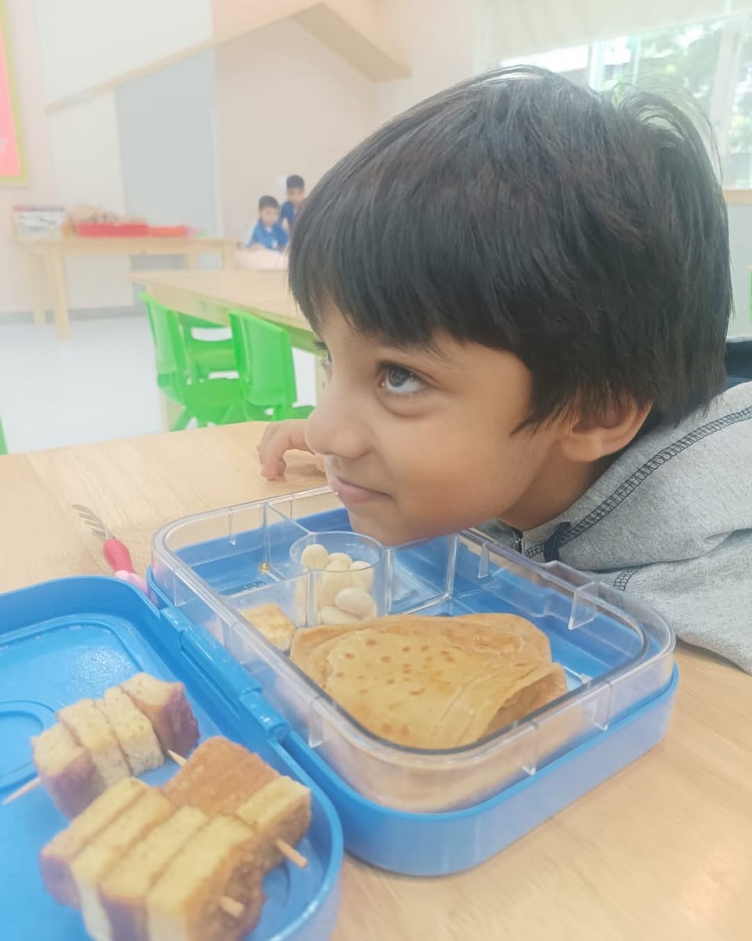 This boy in school, contemplating on what he should eat first or eat at all . 🙈 Kids and their mood swings. #backtoschool #morningbaby #lunchbox #livestoeat #excitingmeal #newschool