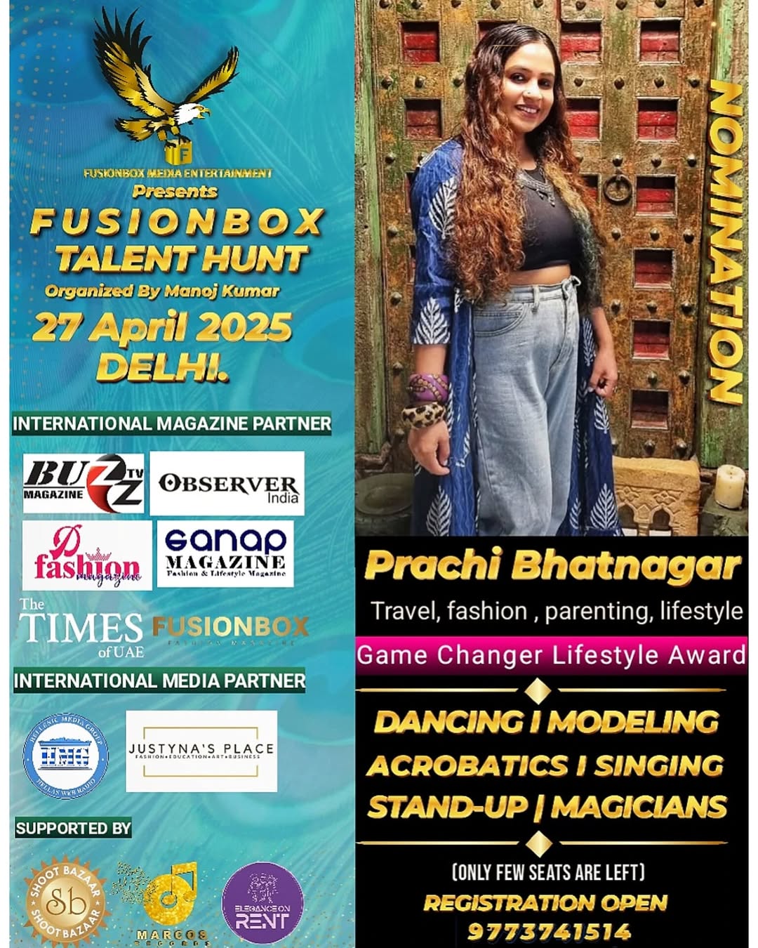 Fusionbox Media Entertainment Presenting FusionBox Talent Hunt 2025. We’re on a mission to discover and celebrate exceptional talent across various fields! 🎭🎤🎨 , Join us on April 27, 2025, in Delhi for an electrifying showcase of creativity and passion. As part of this grand event, we’re also honoring rising influencers who have built their presence with dedication and innovation. Huge congratulations to @dilliwalakabir(Prachi Bhatnagar) for being nominated in the FusionBox Talent Awards! 🎉👏 Think you’ve got what it takes? Register now to showcase your talent! 🎶🔥 📢 Want to showcase your brand?Stall bookings are open—DM us to reserve your spot! 🛍️✨ #FusionBoxTalentHunt #TalentHunt2025 #InfluencerAwards #RegisterNow #bookyourstallnow